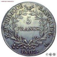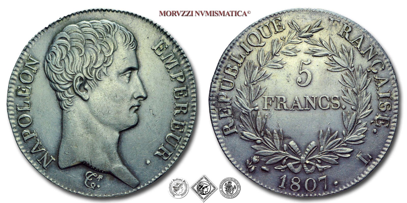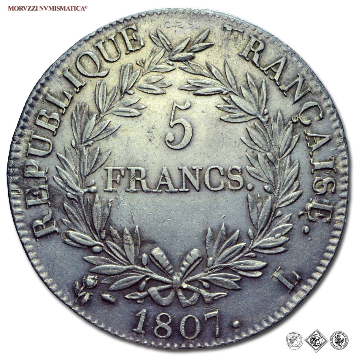 Francia, Napoleone I, 1804-1814, FRANCHI 5, Emissione: 1807 L, D/ NAPOLEON EMPEREUR •, testa nuda a destra; sotto: simbolo di Pierre-Joseph Tiolier (Graveur général des monnaies - incisore generale dal 1803 al 1815). Incisore: Nicolas-Antoine Brenet, R/ REPUBLIQUE FRANÇAISE, Denominazione (5 / FRANCS) su due righe all'interno di una corona d'alloro; sotto: un tulipano (simbolo di Pierre-Romain Darripe, Maestro di Zecca, Bayonne 1803-1810), il millesimo (1807) e il segno di zecca (L). Incisore: Nicolas-Antoine Brenet, Zecca di Bayonne, Rif. bibl. Gadoury, 581; Metallo: AR, gr. 25,09, (MZ152563), Diam.: mm. 38,55, mSPL