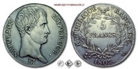 Francia, NAPOLEONE I, Imperatore, 1804-1814, FRANCHI 5, Emissione: AN 13 (1804/5), D/ NAPOLEON EMPEREUR •, testa nuda a destra; sotto: simbolo di Pierre-Joseph Tiolier (Graveur général des monnaies - incisore generale dal 1803 al 1815), R/ RÉPUBLIQUE FRANÇAISE •, Denominazione (5 / FRANCS) su due righe all'interno di una corona d'alloro; sotto: un grappolo d'uva (simbolo di Jean-Marie de Sainte-Croix, Maestro di Zecca, Perpignan), il millesimo (• AN 13 •) e il segno di zecca (• Q •). Incisore: Pierre-Joseph Tiolier, Zecca di Perpignan, Rif. bibl. Gadoury, 580; Metallo: AR, gr. 24,83, (ME162111), Diam.: mm. 37,61, BB