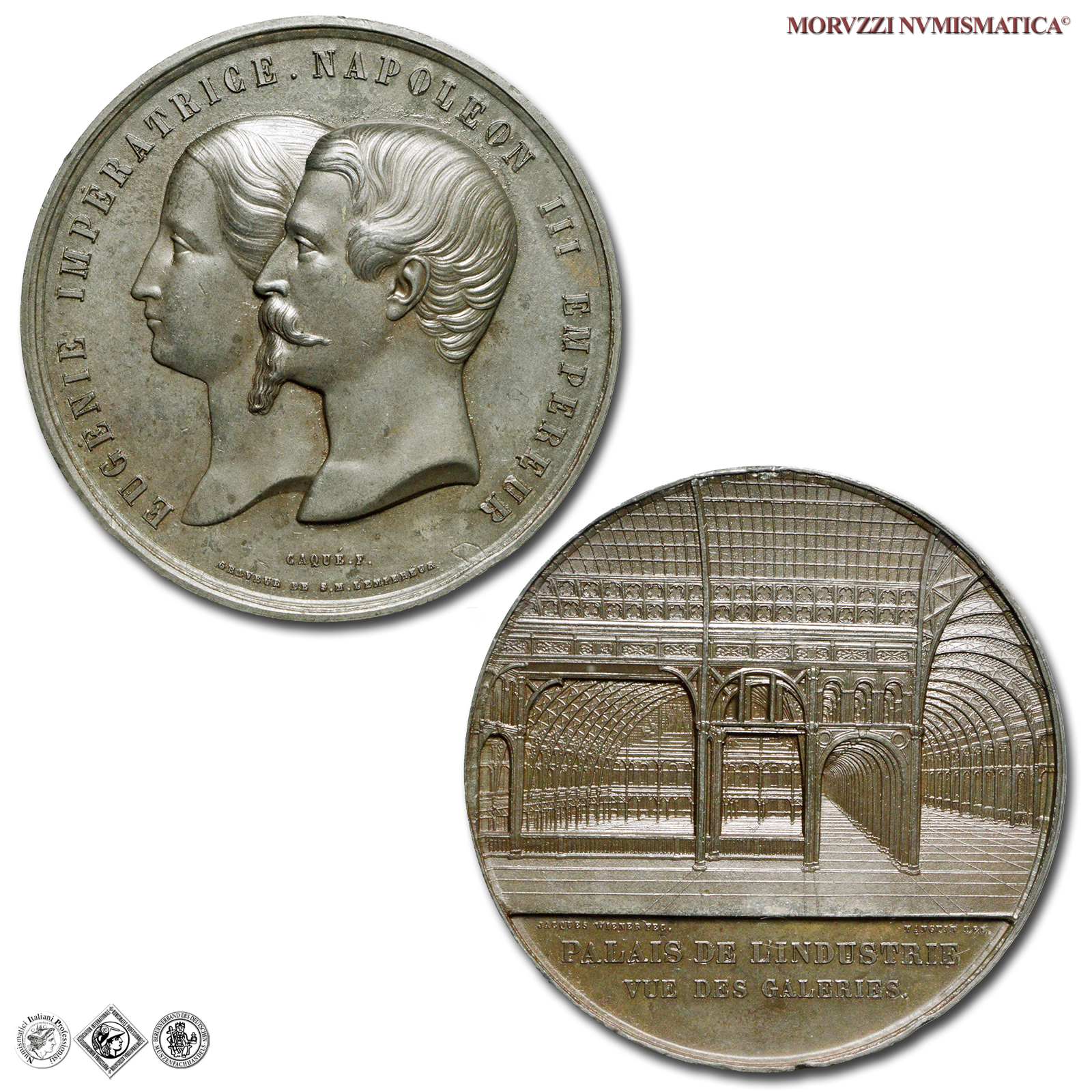Francia, NAPOLEONE III, Imperatore, MEDAGLIA, Emissione: 1855, D/ EUGENIE IMPERATRICE. NAPOLEON III EMPEREUR, teste accollate di Napoleone III e della moglie Eugenia, R/ PALAIS DE L'INDUSTRIE VUE DES GALERIES, prospettiva interna del palazzo delle Industrie con le gallerie, Opus Armand-Auguste Caqué, Gervais e C., Metallo: ZN, gr. 128,82, (MV162133), Diam.: mm. 68,30, mSPL