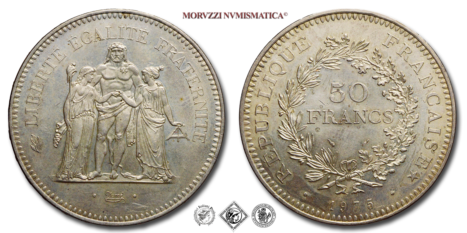 Francia, REPUBBLICA, FRANCHI 50, Emissione: 1975, D/ REPUBLIQUE FRANÇAISE, la denominazione (50 FRANCS) all'interno di una corona di fiori e la data (⦁ 1975 ⦁) in basso. Incisore: Augustin Dupré, R/ LIBERTÉ ÉGALITÉ FRATERNITÉ, la Libertà e l'Uguaglianza, due ideologie spesso non compatibili, riconciliate con la Fraternità da Ercole; in esergo: la firma dell'incisore (⦁ Dupré ⦁), Zecca di Parigi, Rif. bibl. Gadoury, 882; Metallo: AR, gr. 30,08, (ME163067), Diam.: mm. 41,20, qFDC