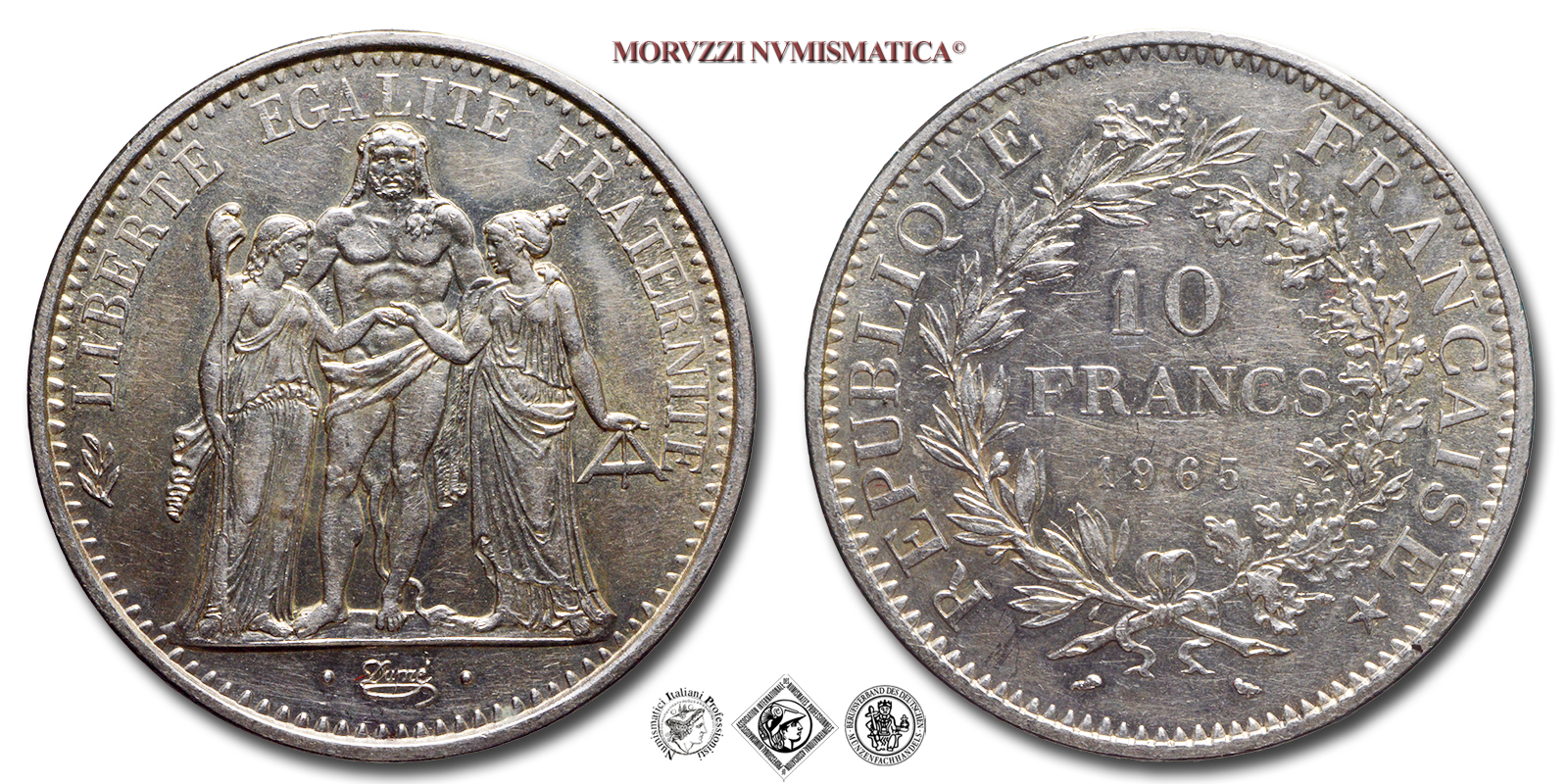 Francia, QUINTA REPUBBLICA, Dal 1959, FRANCHI 10, Emissione: 1965, D/ RÉPUBLIQUE FRANÇAISE, denominazione (10 FRANCS) e data (1965) all'interno di una corona di fiori. Disegnatore: Augustin Dupré, R/ LIBERTÉ ÉGALITÉ FRATERNITÉ, gruppo di Ercole; in esergo, tra due stelle: la firma dell'incisore (Dupré), Zecca di Parigi, Rif. bibl. Gadoury, 813; Metallo: AR, gr. 25,01, (ME159209), Diam.: mm. 37,05, mSPL