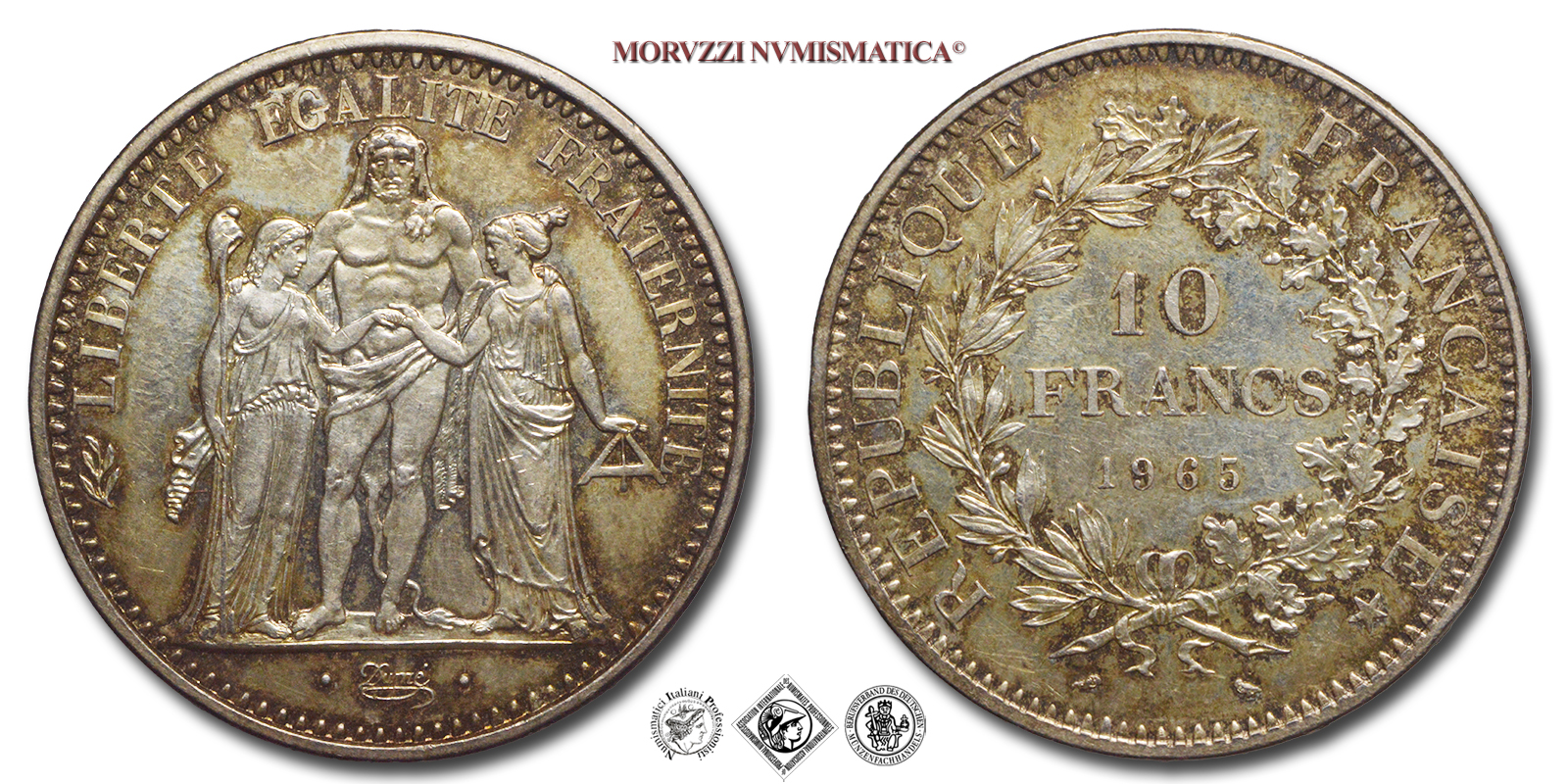 Francia, QUINTA REPUBBLICA, Dal 1959, FRANCHI 10, Emissione: 1965, D/ RÉPUBLIQUE FRANÇAISE, denominazione (10 FRANCS) e data (1965) all'interno di una corona di fiori. Disegnatore: Augustin Dupré, R/ LIBERTÉ ÉGALITÉ FRATERNITÉ, gruppo di Ercole; in esergo, tra due stelle: la firma dell'incisore (Dupré), Zecca di Parigi, Rif. bibl. Gadoury, 813; Metallo: AR, gr. 25,06, (ME151825), Diam.: mm. 37,14, qFDC