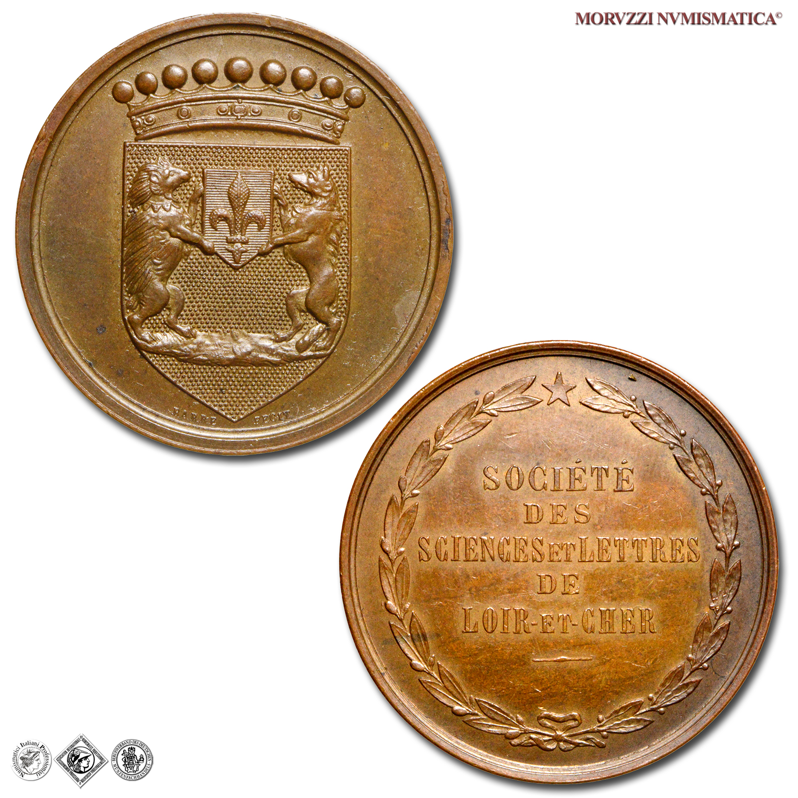 Francia, SOCIETE SCIENCES ET LETTRES, 1815-1893, MEDAGLIA, Emissione: s.d., D/ stemma coronato, R/ SOCIETE DES SCIENCES ET LETTRES DE LOIR ET CHER, in corona di foglie di alloro, Metallo: AE, gr. 16,82, (MV162135), Diam.: mm. 33,70, mSPL