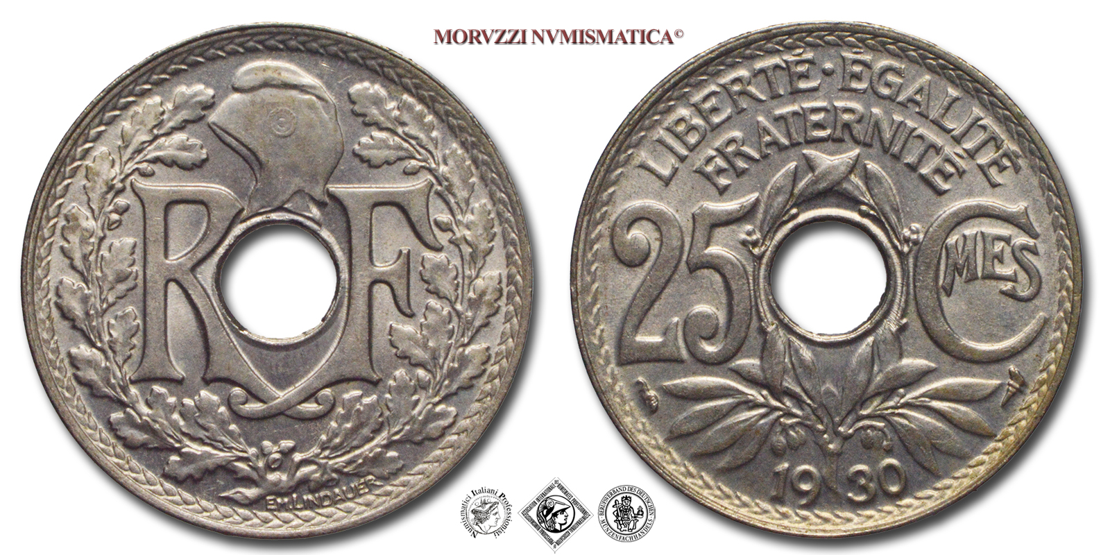 Francia, TERZA REPUBBLICA, 1870-1940, CENTESIMI 25, Lindauer, Emissione: 1930, D/ Monogramma RF diviso da un foro centrale, cappello della libertà sopra, corona di fiori intorno. Incisore: Edmond-Émile Lindauer, R/ La denominazione 25 CMES con l'abbreviazione CMES per "centimes" divisa dal foro centrale con il motto francese (LIBERTE·EGALITE FRATERNITE) sopra e la data (1930) sotto. Nessun trattino sotto "MES". Incisore: Edmond-Émile Lindauer, Zecca di Parigi, Rif. bibl. Gadoury, 380; Metallo: NI, gr. 5,14, (ME62442), Diam.: mm. 24,08, qFDC