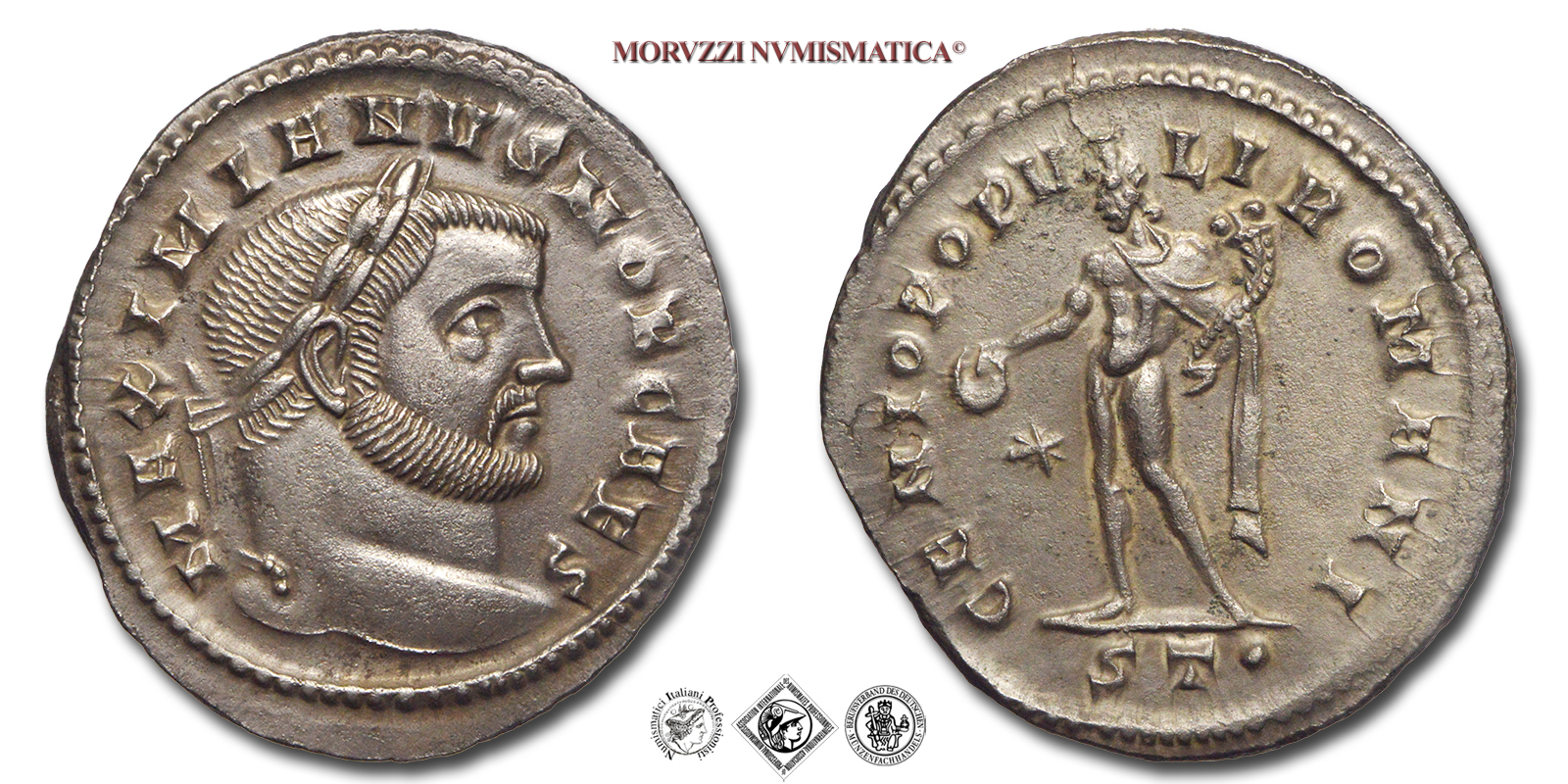 Impero Romano, GALERIO MASSIMIANO, Cesare, 293-311 d.C., FOLLIS, Emissione: 298-299 d.C., D/ MAXIMIANVS NOB CAES, testa laureata a destra, R/ GENIO POPVLI ROMANI / S T •, il Genio stante a sinistra con il modius sul capo ed il mantello sulla spalla sinistra, tiene una patera nella mano destra ed una cornucopia nella sinistra. A sinistra una stella, Zecca di Ticinum, Rif. bibl. R.I.C., 35b; Cohen, 91; Metallo: AE, gr. 9,46, (MR160399), Diam.: mm. 25,39, mSPL
