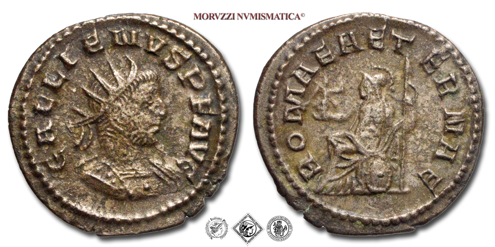 Impero Romano, GALLIENO, 253-268 d.C., ANTONINIANO, Emissione: 253-268 d.C., D/ GALLIENVS P F AVG, busto radiato con corazza a destra, R/ ROMAE AETERNAE, Roma galeata seduta sugli scudi a sinistra con Vittoria nella destra e lungo scettro nella sinistra, Zecca Asiatica, Rif. bibl. R.I.C., 654; Cohen, 920; Metallo: AE, gr. 4,23, (MR160230), Diam.: mm. 22,64, BB
