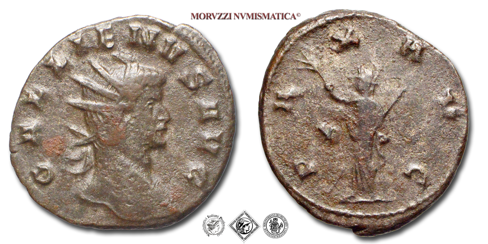 Impero Romano, GALLIENO, 253-268 d.C., ANTONINIANO, Emissione: 253-268 d.C., D/ GALLIENVS AVG, testa radiata a destra, R/ PAX AVG, V, la Pax stante a sinistra con un ramoscello nella destra ed uno scettro nella sinistra, Zecca di Roma, Rif. bibl. R.I.C., 256 var.; Cohen, 728; Metallo: AE, gr. 4,08, (MR160262), Diam.: mm. 20,67, BB