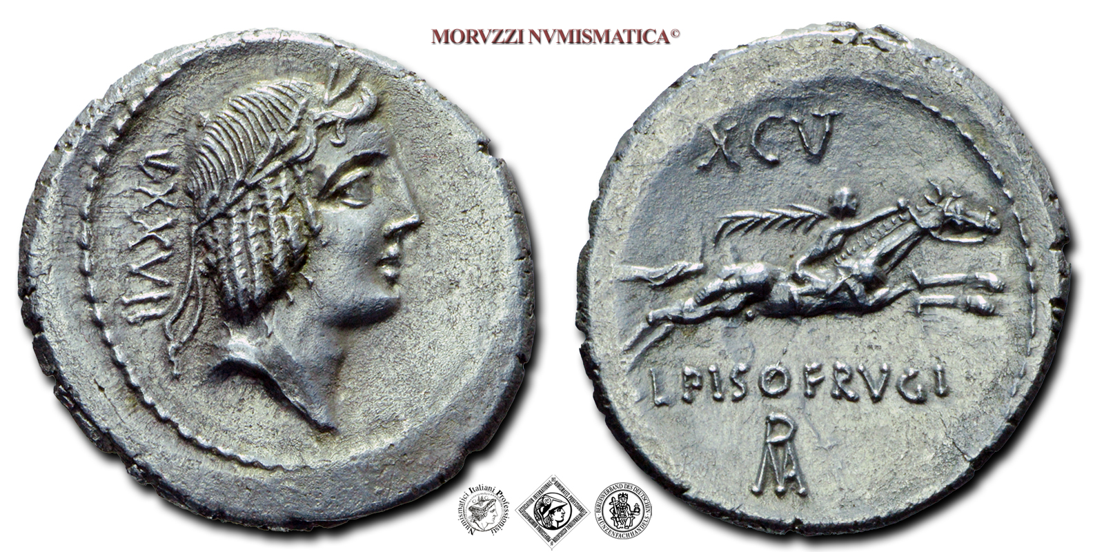 Repubblica Romana, GENS CALPURNIA, L. Calpurnius Piso Frugi, DENARIO, Emissione: 90 a.C., D/ testa di Apollo laureato a d.; dietro la nuca: LXXVII, R/ cavaliere al galoppo a d., con ramo di palma; in alto: XCV; sotto, su due righe: L·PISO·FRVGI / ROMA in monogramma, Zecca di Roma, Rif. bibl. Craw., 340/1; Bab., 11; Syd., 665; Metallo: AR, gr. 3,90, (MR155207), Diam.: mm. 20,47, SPL