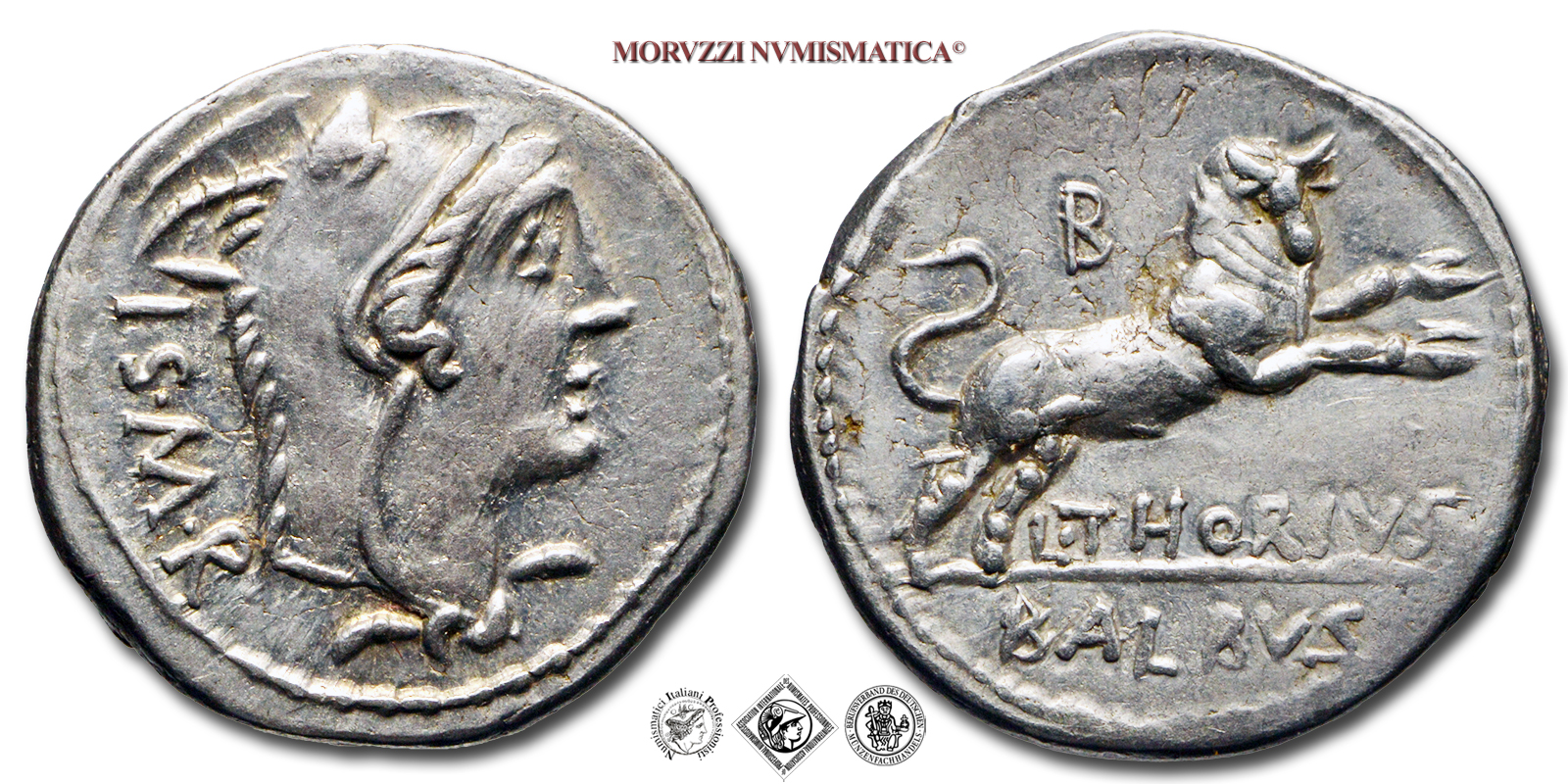 Repubblica Romana, GENS THORIA, L. Thorius Balbus, DENARIO, Emissione: 105 a.C., D/ I•S•M•R, testa di Giunone Lanuvina a d., coperta dalla pelle di capra, R/ L•THORIVS, toro scalpitante a d.; sopra: lettera di controllo (B); in esergo: BALBVS, Zecca di Roma, Rif. bibl. Craw., 316/1; B.M.C.R.R., 1615; Bab., 1; Syd., 598; Metallo: AR, gr. 3,84, (MR159006), Diam.: mm. 20,12, SPL