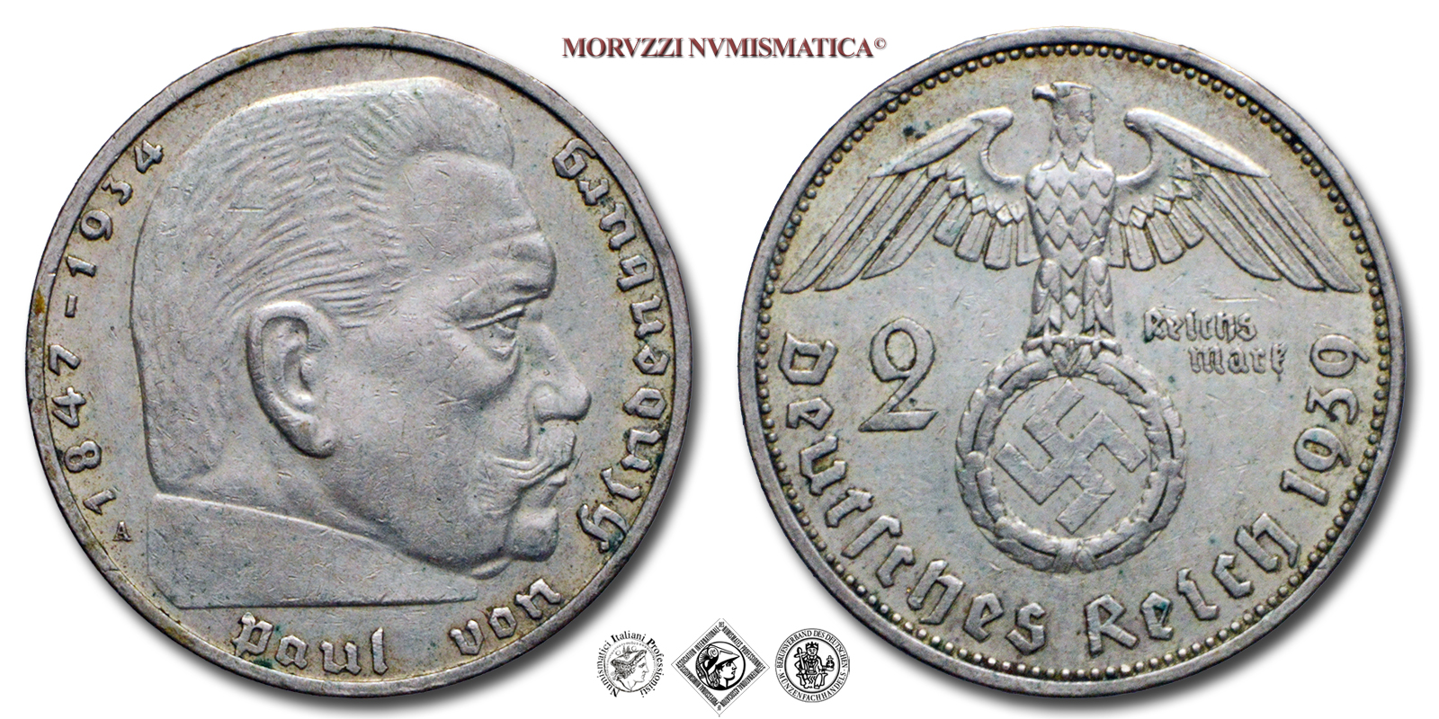 Germania, TERZO REICH, MARCHI 2, Paul von Hindenburg, Emissione: 1939 A, D/ 1847-1934 Paul von Hindenburg A, testa di Paul von Hindenburg rivolta a destra con il segno di zecca (A) tra il collo e "1847". Incisore: A. Vocke, R/ Deutsches Reich 1939, aquila tiene una corona di foglie di quercia sopra la svastica al centro della corona; denominazione (2 Reichs Mark) sui lati. Incisore: F. Krischker, Zecca di Berlino, Rif. bibl. Jaeger, 366; Metallo: AR, gr. 8,00, (ME162881), Diam.: mm. 24,89, SPL