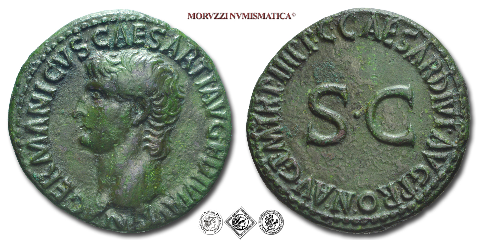 Impero Romano, GERMANICO, + 19 d.C., ASSE, Emissione: 39-40 d.C., D/ GERMANICVS CAESAR TI AVG F DIVI AVG N, testa nuda a sinistra, R/ C CAESAR DIVI AVG PRON AVG P M TR P III P P, S C grande al centro, Zecca di Roma, Rif. bibl. R.I.C., 43/R2; Cohen, 4 var.; Metallo: AE, gr. 11,51, (MR149442), Diam.: mm. 28,53, mBB, (RR)