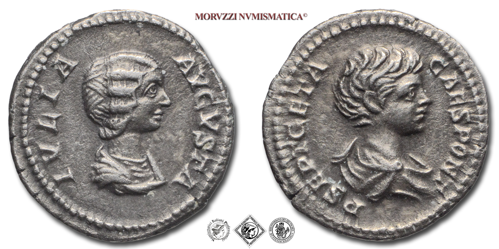 Impero Romano, GIULIA DOMNA, Moglie di Settimio Severo, 193-211 d.C., DENARIO, Emissione: 193-217 d.C., D/ IVLIA AVGVSTA, busto ammantato a destra, R/ P SEPT GETA CAES PONT, busto con paludamento e corazza a destra, Zecca di Roma, Rif. bibl. R.I.C., 571/R; Cohen, 1/Fr.60; Metallo: AR, gr. 3,27, (MR162743), Diam.: mm. 18,60, mBB, (R)