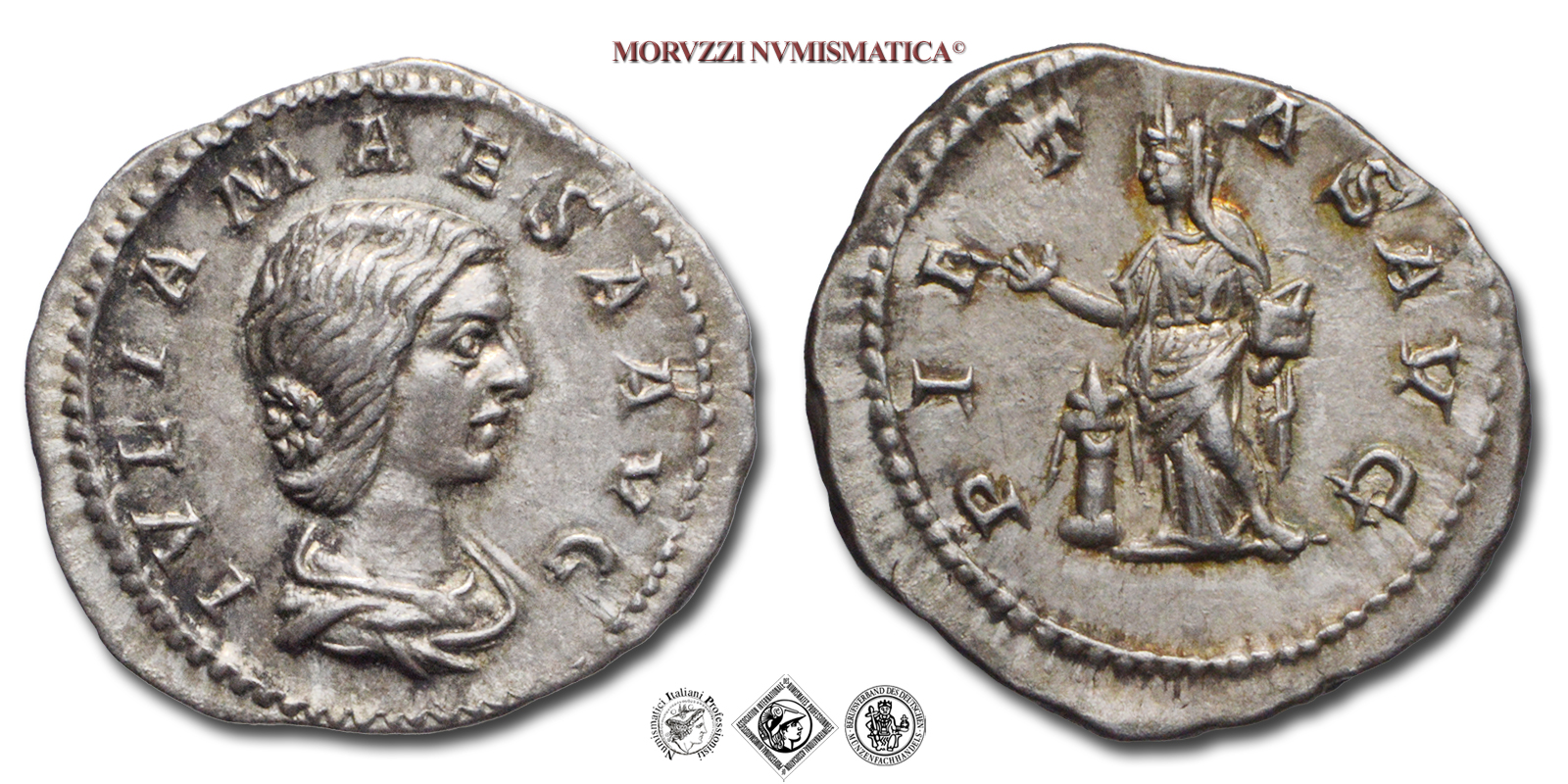 Impero Romano, GIULIA MESA, Sorella di Giulia Domna, 222-235 d.C., ANTONINIANO, Emissione: 218-222 d.C., D/ IVLIA MAESA AVG, busto diademato su crescente lunare a d., R/ PIETAS AVG, la Pietas velata stante di fronte con la testa a s. leva in alto la d. al di sopra di un altare acceso e con la s. sorregge una scatola per incenso, Zecca di Roma, Rif. bibl. R.I.C., 264/S; Cohen, 30/Fr. 6; Metallo: AE, gr. 3,02, (MR162747), Diam.: mm. 20,49, SPL, (R)
