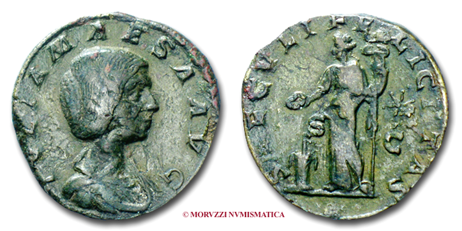 Impero Romano, GIULIA MESA, Nonna di Elagabalo, SESTERZIO, Emissione: 218-222 d.C., D/ IVLIA MAESA AVG, busto ammantato a d., R/ SAECVLI FELICITAS / S C, Felicitas stante a s. sacrifica su un altare versando il contenuto di una patera e tiene il caduceo nella s.; nel campo a d. una stella, Zecca di Roma, Rif. bibl. R.I.C., 421/S; Cohen, 47/Fr.6; Metallo: AE, gr. 20,04, (MR77306), Diam.: mm. 29,64, BB, (R)