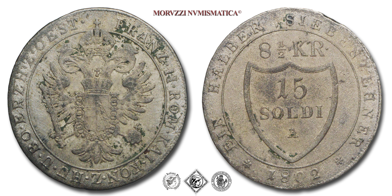 Gorizia, FRANCESCO II D'ASBURGO, 1797-1805, SOLDI 15, Emissione: 1802 A, D/ FRANZ • II • ROM • KAI • KON • Z • HU • O • BO • ERZH • Z • OEST •, all'interno di un cerchio, aquila araldica asburgica sormontata dalla corona imperiale, R/ Nel giro: EIN HALBER SIEBENZENHER, in cerchio lineare 15 / SOLDI / segno di zecca (A) in scudo a cuore all'interno di cerchio lineare; in basso, nel giro, millesimo (1802) tra due rosette. Al di sopra dello scudo indicazione del valore in Kreuzer (8 ½ • KR •). Intorno EIN HALBER SIEBENZENHER (metà di diciassette:otto e mezzo) nel giro, Zecca di Vienna, Rif. bibl. Pagani, 276; Metallo: AR, gr. 5,11, (MI83501), Diam.: mm. 27,40, BB, (R)