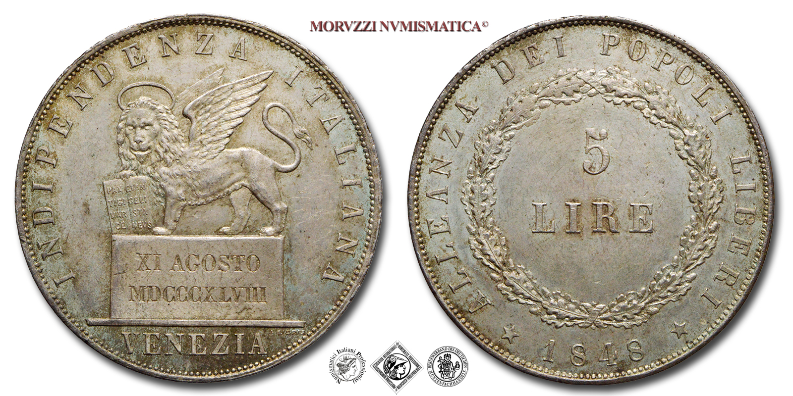 Venezia, GOVERNO PROVVISORIO, 1848-1849, LIRE 5, Emissione: 1848, D/ Indicazione del valore (5 LIRE) su due righe circondato una corona di rami di quercia. Intorno ALLEANZA DEI POPOLI LIBERI, sotto separato da questa scritta da due stelle a 5 punte l'indicazione del millesimo (1848), R/ Leone di S. Marco posto su di un piedistallo che reca la scritta in incuso XI AGOSTO MDCCCXLVIII su due righe. Intorno INDIPENDENZA ITALIANA. In esergo VENEZIA e sotto il basamento del leone a destra indicazione dell'incisore A. FABRIS, Zecca di Venezia, Rif. bibl. Pagani, 178; Metallo: AR, gr. 25,00, (MZ160120), Diam.: mm. 37,56, qFDC, (R)