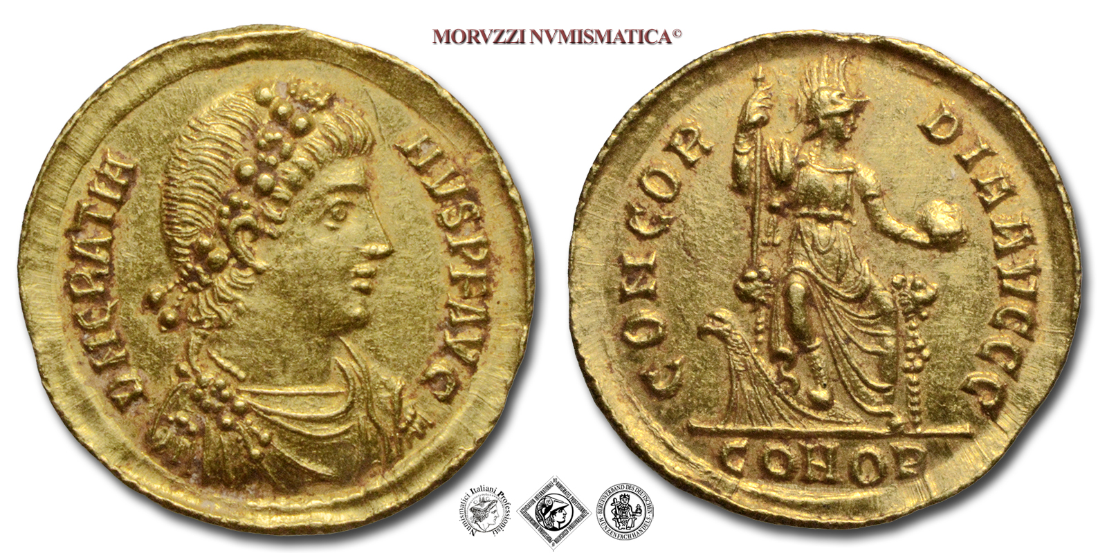 Impero Romano, GRAZIANO, 367-383 d.C., SOLIDO, Emissione: 375-378 d.C., D/ D N GRATIANVS P F AVG, busto diademato con paludamento a destra, R/ CONCORDIA AVGG, CONOB, Costantinopoli seduta in trono a destra poggia il piede su prora e regge nella destra l'asta e il globo nella sinistra, Zecca di Costantinopoli, Rif. bibl. R.I.C., 44a/R; Cohen, 5/Fr.20; Depeyrot, 31/1; Metallo: AU, gr. 4,48, (MR161593), Diam.: mm. 20,88, qFDC, (R)
