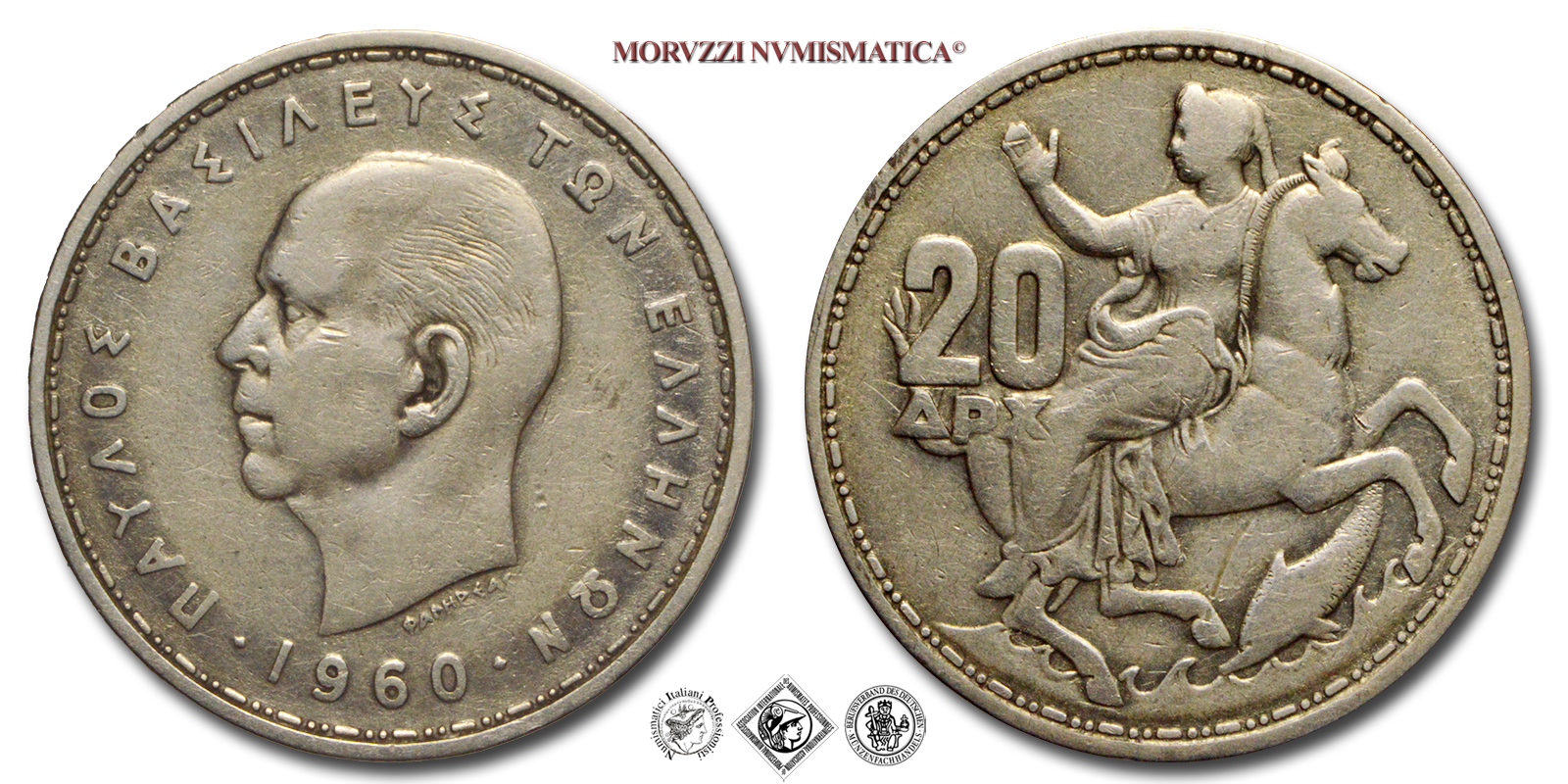 Grecia, PAOLO I, 1947-1964, DRACME 20, Emissione: 1960, D/ ΠΑΥΛΟΣ ΒΑΣΙΛΕΥΣ ΤΩΝ ΕΛΛΗΝΩΝ ΦΑΛΙΡΕΑ⥌, Busto di Paolo I rivolto a sinistra con la data (⬩1960⬩) in basso. Incisore: Vasos Falireas, R/ Anfitrite, moglie di Poseidone, a cavallo sopra delfino e onde con denominazione (20 ΔΡΧ) a sinistra, Incisore: Vasos Falireas, Rif. bibl. KM, 85; Metallo: AR, gr. 7,38, (ME162432), Diam.: mm. 26,22, BB