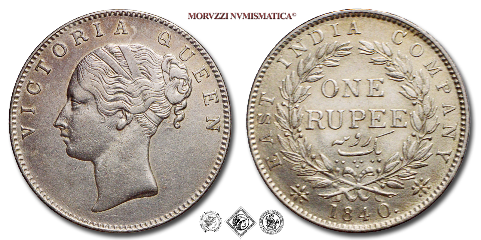 India, VITTORIA, 1837-1901, RUPIA, Emissione: 1840, D/ VICTORIA QUEEN, busto della regina Vittoria rivolto a sinistra. Incisore: William Wyon, R/ EAST INDIA COMPANY, la denominazione (ONE RUPEE یک روپیہ) all'interno di una corona, la data (1840 .) sotto, Zecca di Calcutta, Rif. bibl. KM, 458.1; Metallo: AR, gr. 11,64, (ME163034), Diam.: mm. 30,46, SPL