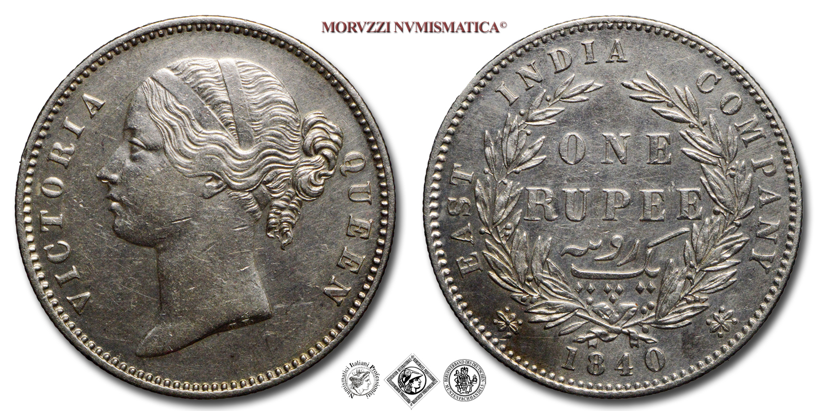 India, VITTORIA, 1837-1901, RUPIA, 27 bacche, Emissione: 1840, D/ VICTORIA QUEEN, busto della regina Vittoria rivolto a sinistra. Incisore: William Wyon, R/ EAST INDIA COMPANY, la denominazione (ONE RUPEE یک روپیہ) all'interno di una corona, la data (1840) sotto, Zecca di Bombay, Rif. bibl. KM, 458.3; Metallo: AR, gr. 11,67, (ME161361), Diam.: mm. 30,54, SPL