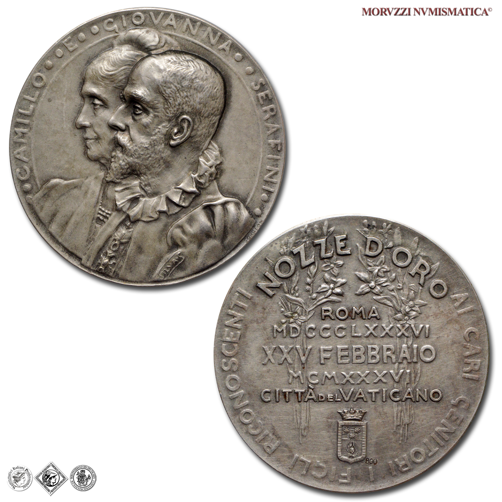 Italia, CAMILLO e GIOVANNA SERAFINI, MEDAGLIA, Nozze d'oro, Emissione: 1936, D/ CAMILLO E GIOVANNA SERAFINI, busti dei coniugi accollati a s., R/ NOZZE D'ORO ROMA MDCCCL XXXVI, XXV FEBBRAIO MCMXXXVI CITTA' DEL VATICANO I FIGLI RICONOSCENTI AI CARI GENITORI, Metallo: AR, gr. 34,10, (MV146953), Diam.: mm. 14,58, qFDC, (RR)