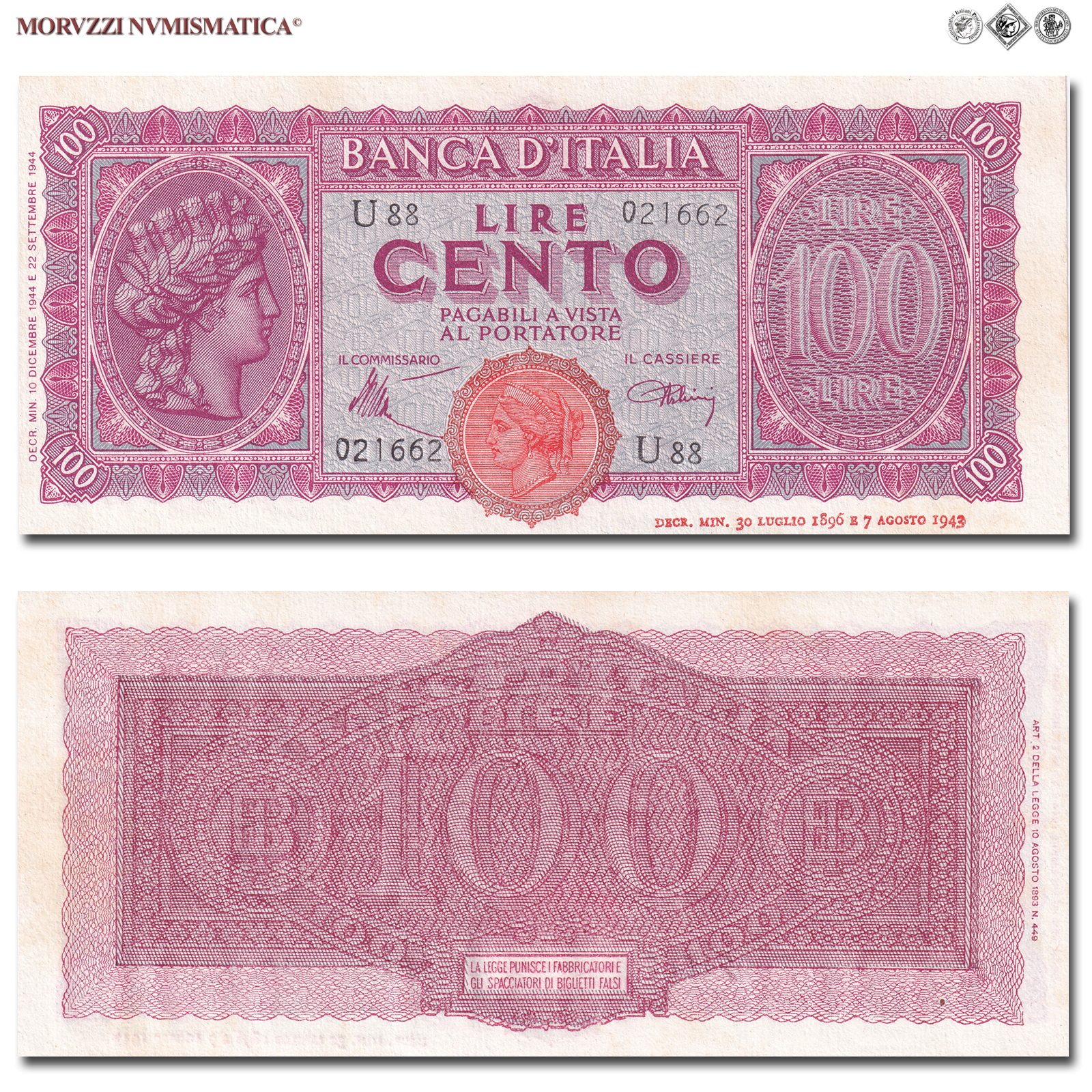 Italia, Luogotenenza, BANCA D'ITALIA, LIRE 100, Italia turrita, 10.12.1944, D/ nell'ovale sinistro testa dell'Italia turrita con stella; in quello destro "Lire 100", R/ cifra "100" tra due monogrammi "B.I.", Rif. bibl. Crapanzano, 260A; (CM103860), Firme: Introna, Urbini, n° di serie: U88 021662, FDS