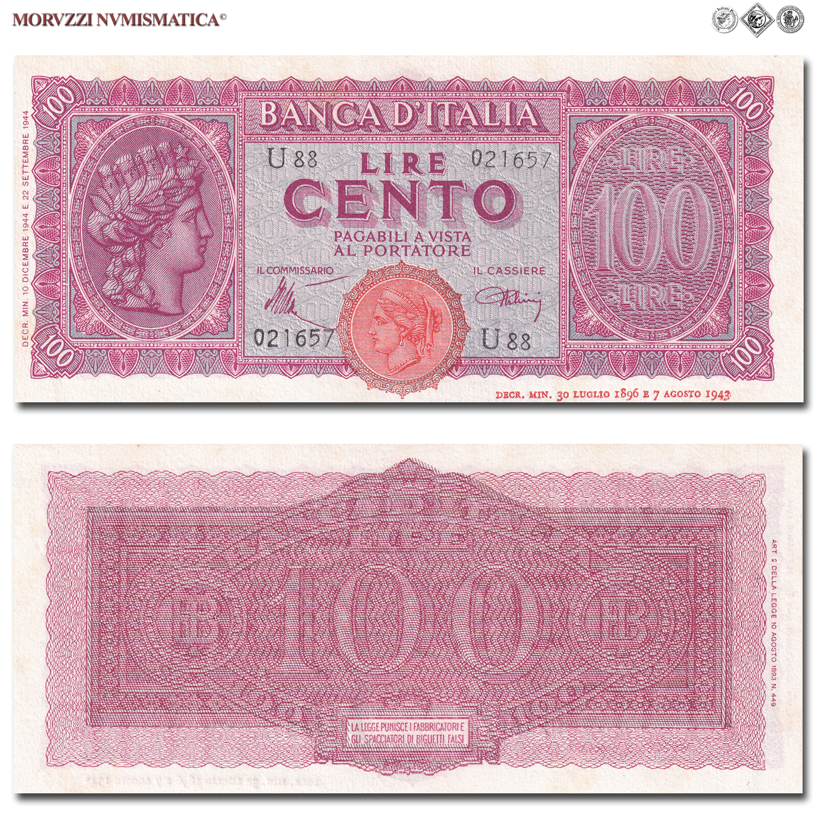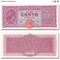 Italia, Luogotenenza, BANCA D'ITALIA, LIRE 100, Italia turrita, 10.12.1944, D/ nell'ovale sinistro testa dell'Italia turrita con stella; in quello destro "Lire 100", R/ cifra "100" tra due monogrammi "B.I.", Rif. bibl. Crapanzano, 260A; (CM103855), Firme: Introna, Urbini, n° di serie: U88 021657, FDS