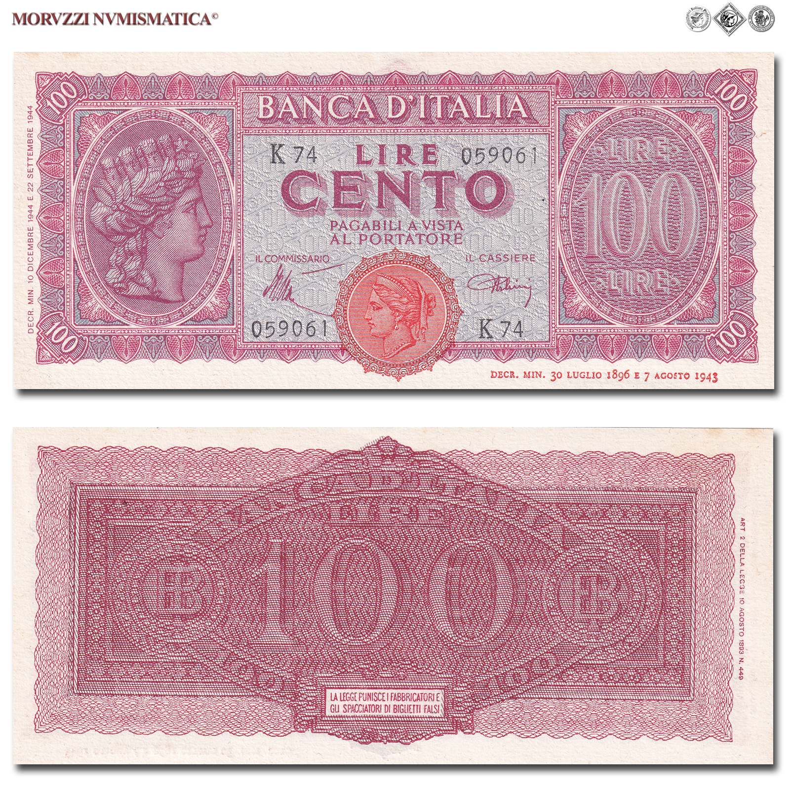 Italia, Luogotenenza, BANCA D'ITALIA, LIRE 100, Italia turrita, 10.12.1944, D/ nell'ovale sinistro testa dell'Italia turrita con stella; in quello destro "Lire 100", R/ cifra "100" tra due monogrammi "B.I.", Rif. bibl. Crapanzano, 260A; (CM115595), Firme: Introna, Urbini, n° di serie: K74 059061, FDS