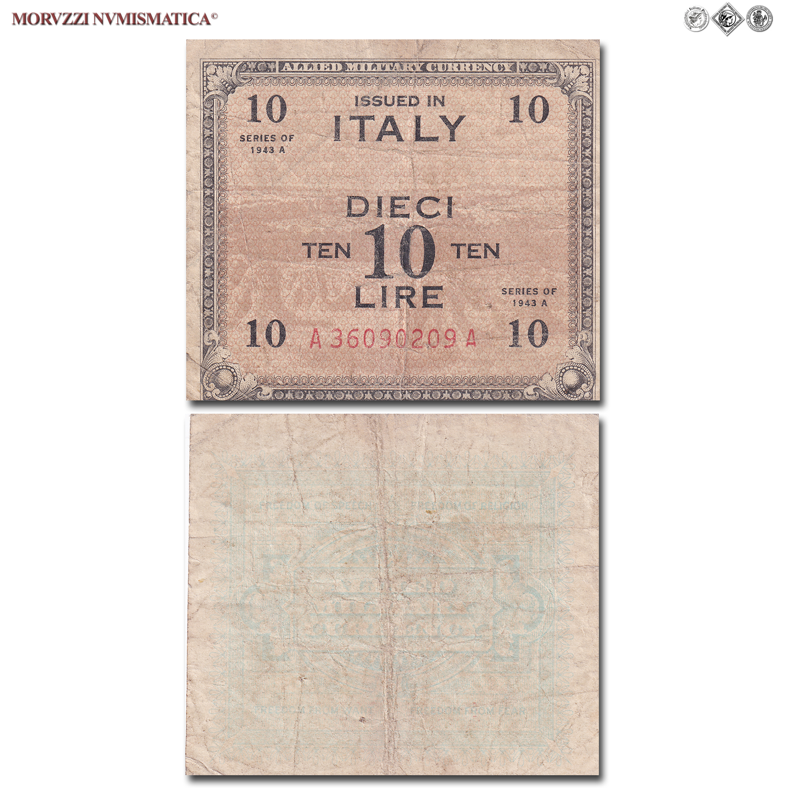 Italia, Occupazione Americana, ALLIED MILITARY CURRENCY, AM LIRE 10, Bilingue, Tipografia: FLC (Forbes Lithograph Corporation), 1943 A, D/ Sullo sfondo paesaggio agricolo con covoni di grano e contorno nero; scritta "DIECI LIRE - TEN TEN" al centro e cifra "10" sui quattro angoli, R/ Al centro scritta "ALLIED MILITARY CURRENCY" e tutto intorno le quattro libertà costituzionali statunitensi: "Freedom of Speech - Freedom of Religion - Freedom from Want - Freedom from Fear", Rif. bibl. Crapanzano, OS57A; (CM133293), Firme: FLC, n° di serie: A 36090209 A, MB