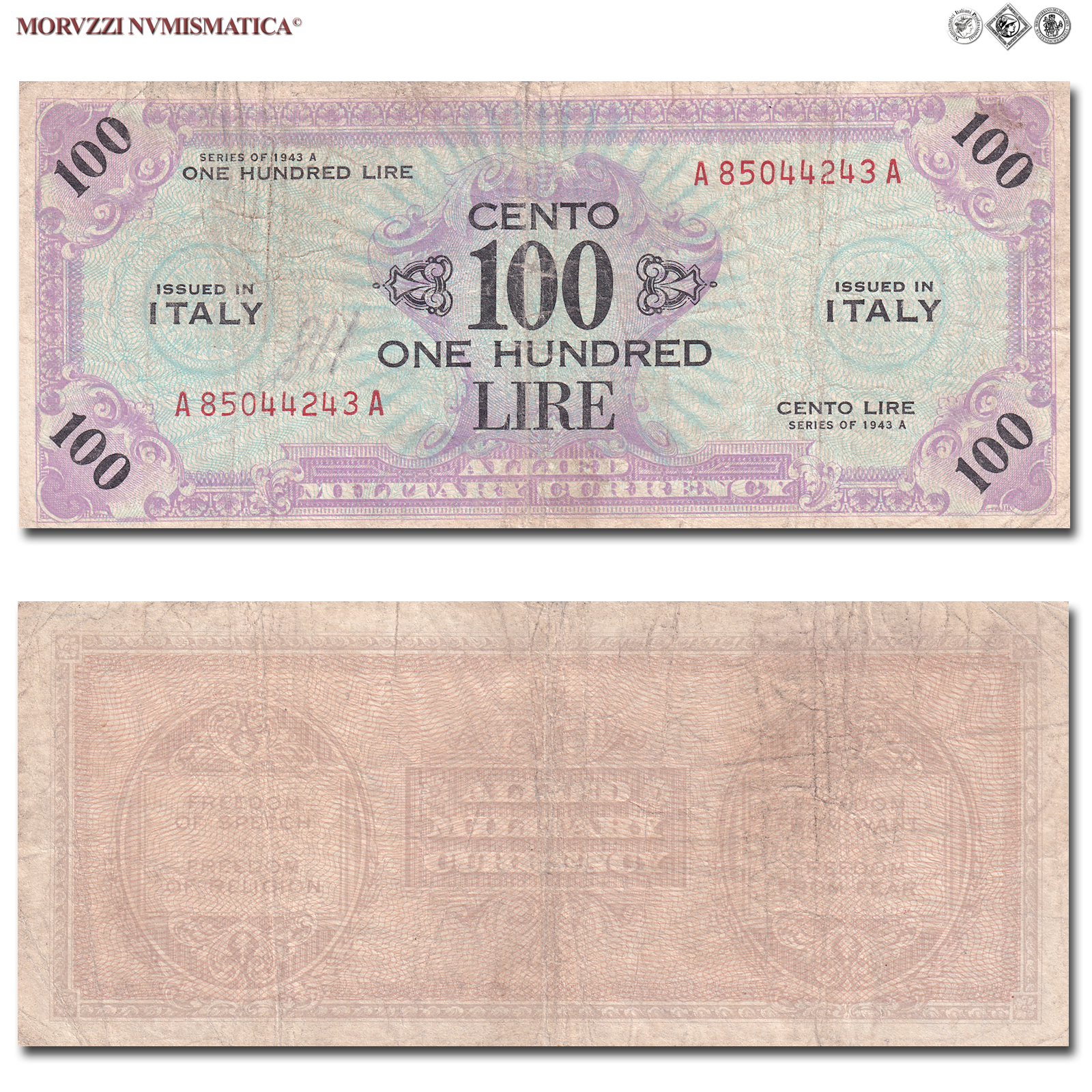 Italia, Occupazione Americana, ALLIED MILITARY CURRENCY, AM LIRE 100, Bilingue, Serie A-A, 1943 A, D/ scritta "CENTO LIRE - ONE HUNDRED" al centro e cifra "100" sui quattro angoli; contorno rosa, R/ Al centro scritta "ALLIED MILITARY CURRENCY" e tutto intorno le quattro libertà costituzionali statunitensi: "Freedom of Speech - Freedom of Religion - Freedom from Want - Freedom from Fear", Rif. bibl. Crapanzano, OS61A; (CM133437), Firme: FLC, n° di serie: A 85044243 A, BB