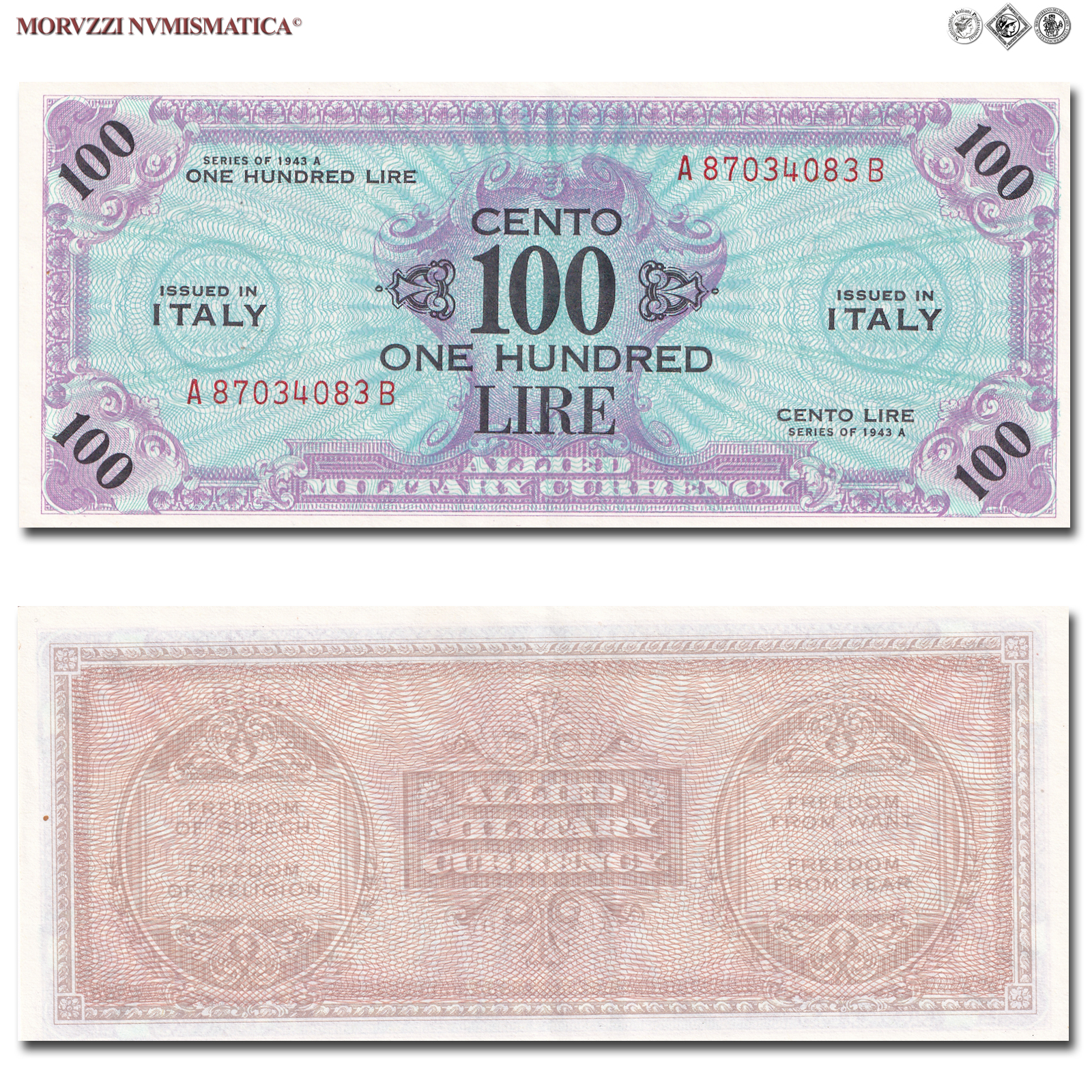 Italia, Occupazione Americana, ALLIED MILITARY CURRENCY, AM LIRE 100, Bilingue, Serie A-B, 1943 A, D/ scritta "CENTO LIRE - ONE HUNDRED" al centro e cifra "100" sui quattro angoli; contorno rosa, R/ Al centro scritta "ALLIED MILITARY CURRENCY" e tutto intorno le quattro libertà costituzionali statunitensi: "Freedom of Speech - Freedom of Religion - Freedom from Want - Freedom from Fear", Rif. bibl. Crapanzano, OS61B; (CM92539), Firme: FLC, n° di serie: A 87034083 B, mSPL
