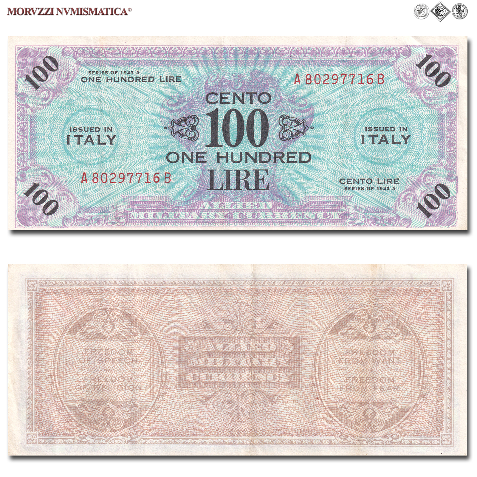 Italia, Occupazione Americana, ALLIED MILITARY CURRENCY, AM LIRE 100, Bilingue, Serie A-B, 1943 A, D/ scritta "CENTO LIRE - ONE HUNDRED" al centro e cifra "100" sui quattro angoli; contorno rosa, R/ Al centro scritta "ALLIED MILITARY CURRENCY" e tutto intorno le quattro libertà costituzionali statunitensi: "Freedom of Speech - Freedom of Religion - Freedom from Want - Freedom from Fear", Rif. bibl. Crapanzano, OS61B; (CM97639), Firme: FLC, n° di serie: A 80297716 B, qSPL