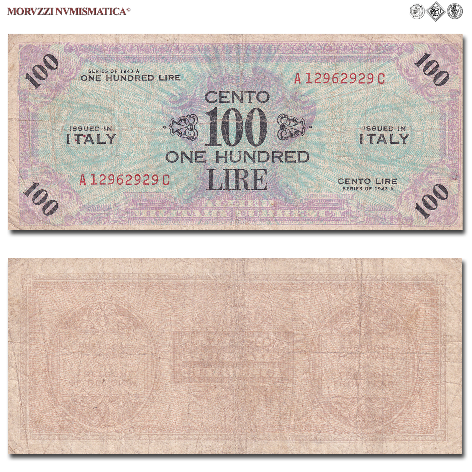 Italia, Occupazione Americana, ALLIED MILITARY CURRENCY, AM LIRE 100, Bilingue, Serie A-C, 1943 A, D/ scritta "CENTO LIRE - ONE HUNDRED" al centro e cifra "100" sui quattro angoli; contorno rosa, R/ Al centro scritta "ALLIED MILITARY CURRENCY" e tutto intorno le quattro libertà costituzionali statunitensi: "Freedom of Speech - Freedom of Religion - Freedom from Want - Freedom from Fear", Rif. bibl. Crapanzano, OS61C; (CM133438), Firme: FLC, n° di serie: A 12962929 C, MB
