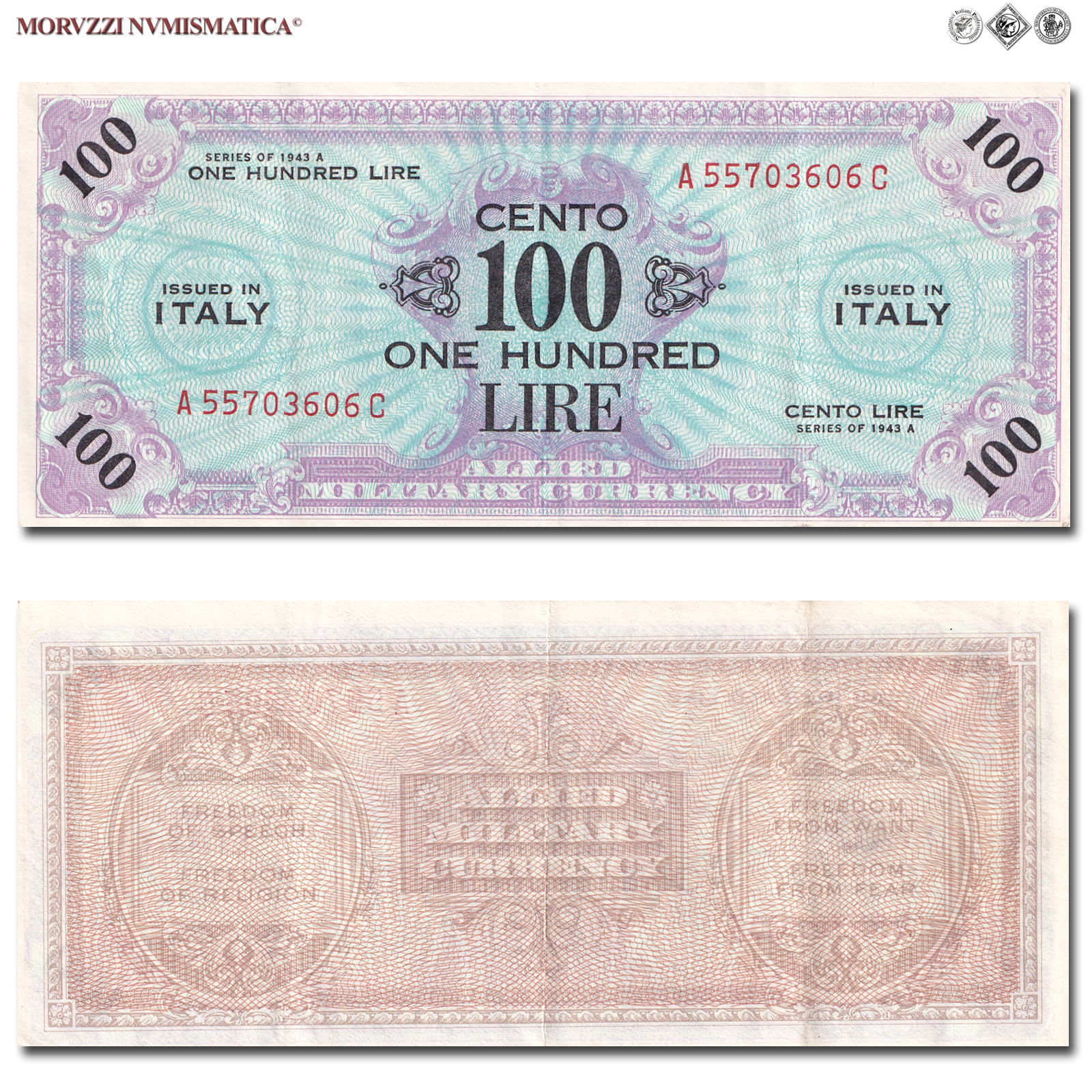 Italia, Occupazione Americana, ALLIED MILITARY CURRENCY, AM LIRE 100, Bilingue, Serie A-C, 1943 A, D/ scritta "CENTO LIRE - ONE HUNDRED" al centro e cifra "100" sui quattro angoli; contorno rosa, R/ Al centro scritta "ALLIED MILITARY CURRENCY" e tutto intorno le quattro libertà costituzionali statunitensi: "Freedom of Speech - Freedom of Religion - Freedom from Want - Freedom from Fear", Rif. bibl. Crapanzano, OS61C; (CM97638), Firme: FLC, n° di serie: A 55703606 C, SPL