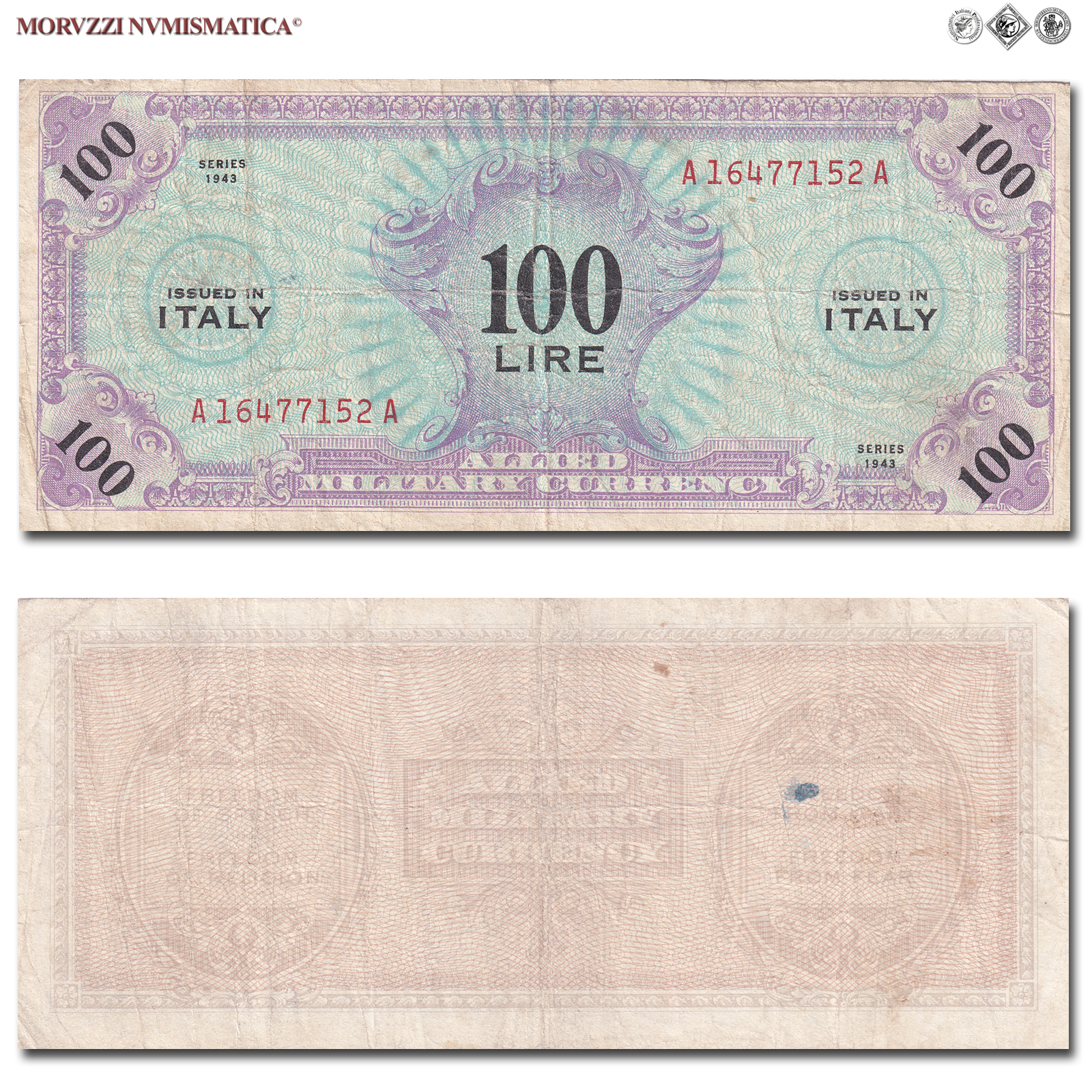 Italia, Occupazione Americana, ALLIED MILITARY CURRENCY, AM LIRE 100, Serie A-A, 1943, D/ Cifra "100 LIRE" entro un ornato al centro e cifra "100" sui quattro angoli; contorno rosa, R/ Al centro scritta "ALLIED MILITARY CURRENCY" e tutto intorno le quattro libertà costituzionali statunitensi: "Freedom of Speech - Freedom of Religion - Freedom from Want - Freedom from Fear", Rif. bibl. Crapanzano, OS47; (CM105165), Firme: FLC, n° di serie: A 16477152 A, qBB