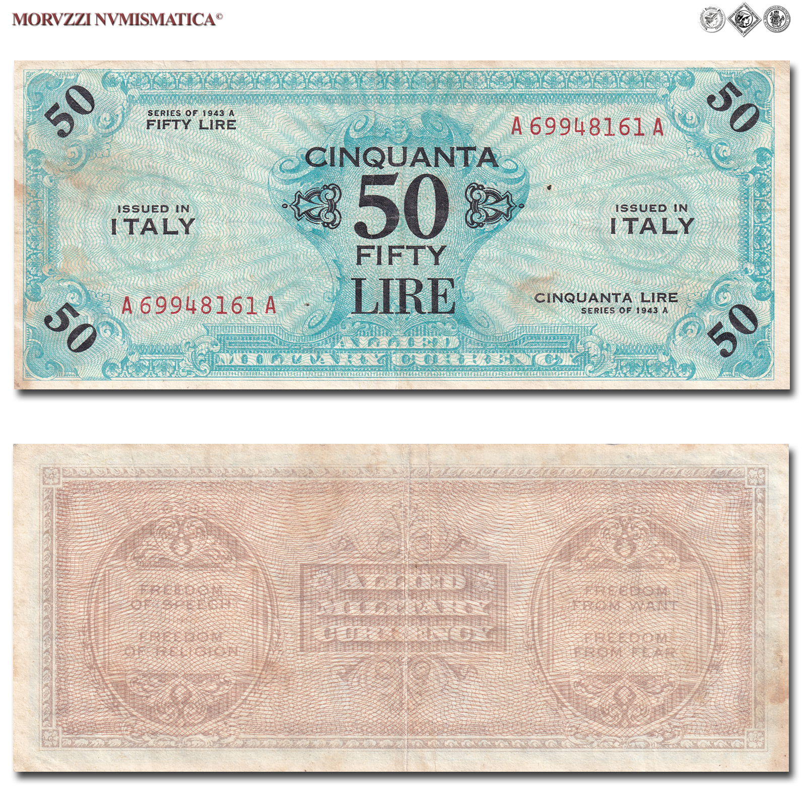 Italia, Occupazione Americana, ALLIED MILITARY CURRENCY, AM LIRE 50, Bilingue, Tipografia: FLC (Forbes Lithograph Corporation), 1943 A, D/ Scritta "CINQUANTA LIRE - FIFTY" al centro entro un ornato; cifra "50" sui quattro angoli; contorno azzurro, R/ Al centro scritta "ALLIED MILITARY CURRENCY" e tutto intorno le quattro libertà costituzionali statunitensi: "Freedom of Speech - Freedom of Religion - Freedom from Want - Freedom from Fear", Rif. bibl. Crapanzano, OS59A; (CM145628), Firme: FLC, n° di serie: A 69948161 A ,mBB