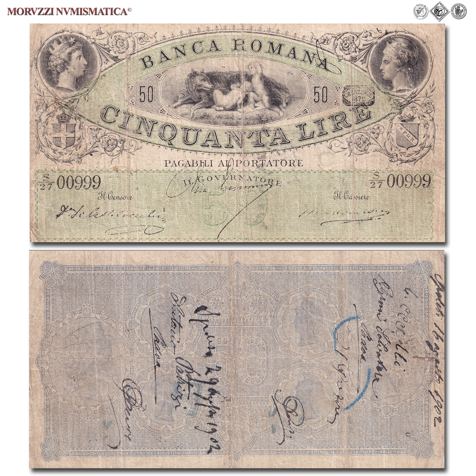 Italia, Vittorio Emanuele II-Umberto I, 1861-1900, BANCA ROMANA, LIRE 50, 1872, D/ Teste dell'Italia turrita e di Roma elmata, Rif. bibl. Crapanzano, BRO7; (CM138394), Firme: Castelvecchi, Guerrini, Lazzaroni, n° di serie: S/27 00999, MB, (RRR)