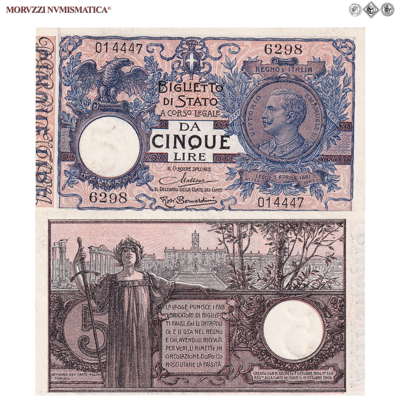 Italia, Vittorio Emanuele III, BIGLIETTO DI STATO, LIRE 5, 10.07.1924, D/ Effige di Vittorio Emanule III di profilo sulla destra, in alto al centro scudo reale coronato, a sinistra aquila, R/ Figura dell'Italia a sinistra e sullo sfondo grande cifra "5" e il Campidoglio, Rif. bibl. Crapanzano, BS26; (CM148569), Firme: Maltese, Rosi Bernardini, n° di serie: 6298 014447, FDS, (R)