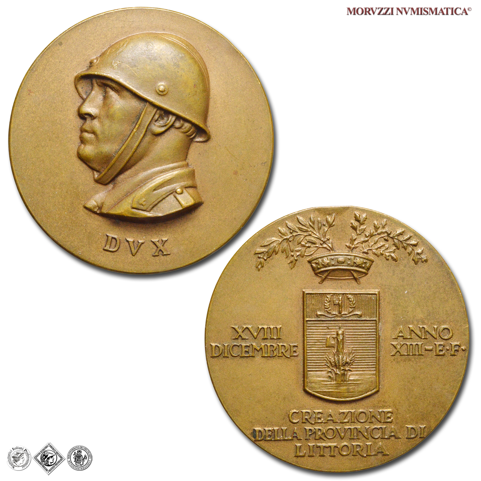 Italia, MUSSOLINI, 1900-1943, MEDAGLIA, Provincia di Littoria, Emissione: 1935, D/ testa elmata di Mussolini a s.; sotto: DVX, R/ Stemma coronato della nuova Provincia, corona sormontata da rami d'alloro ai lati: XVII = DICEMBRE _ ANNO = XIII-E.F.; in basso: CREAZIONE = DELLA PROVINCIA DI = LITTORIA; in basso, a s.: C. VENTRELLA ROMA, Rif. bibl. Casolari, XIII-16; Metallo: AE, gr. 24,02, (MY158439), Diam.: mm. 38,44, mSPL, (R)