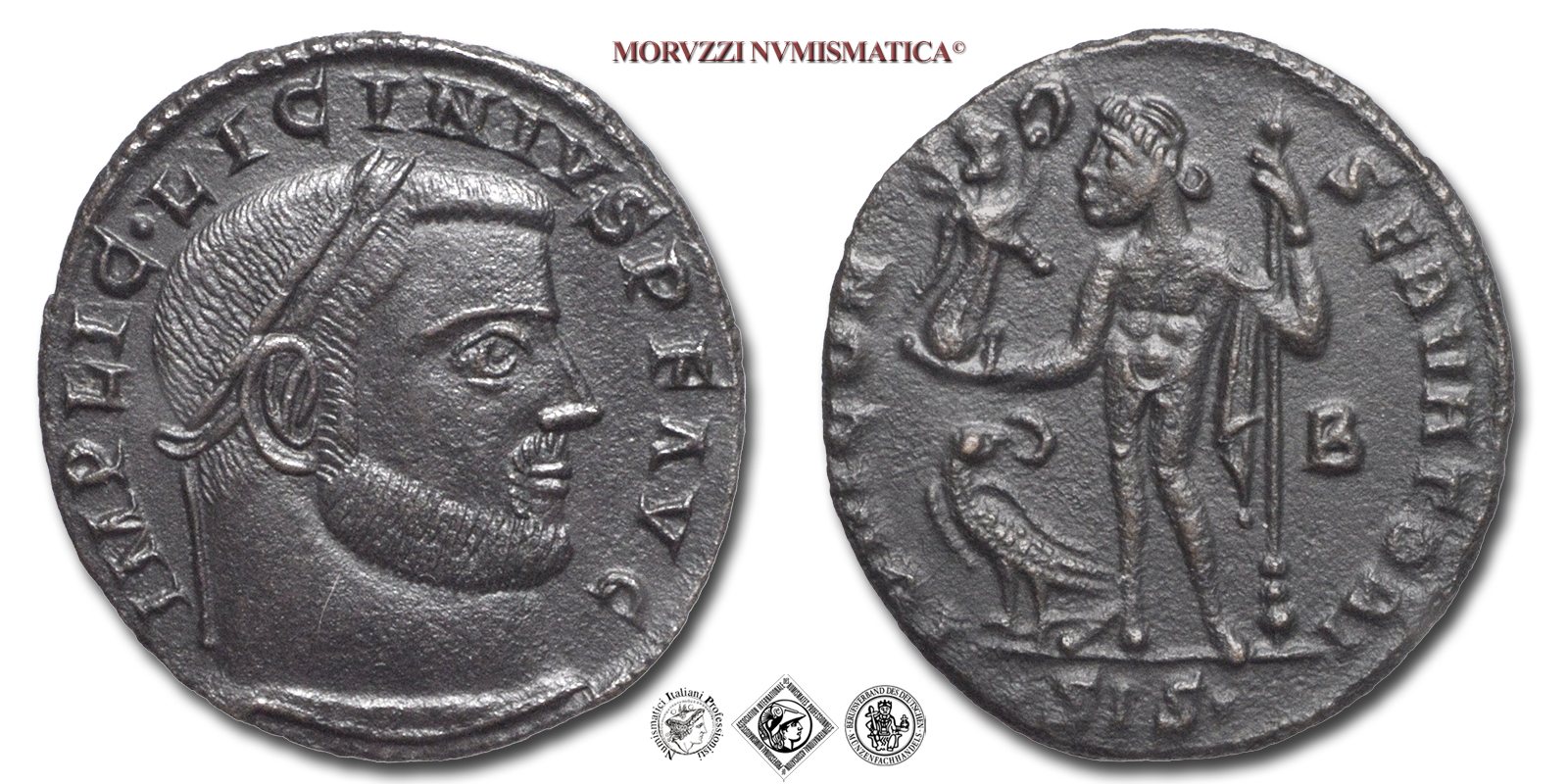 Impero Romano, LICINIO I, 308-324 d.C., FOLLIS, Emissione: 315-316 d.C., D/ IMP LIC LICINIVS P F AVG, testa laureata a destra, R/ IOVI CONSERVATORI, B, SIS tra due globetti, Giove stante a sinistra con globo niceforo nella destra e asta nella sinistra. Ai suoi piedi a sinistra un'aquila con corona nel becco, Zecca di Siscia, Rif. bibl. R.I.C., 17/R2; Cohen, 90; Metallo: AE, gr. 3,57, (MR27161), Diam.: mm. 20,65, SPL, (R)