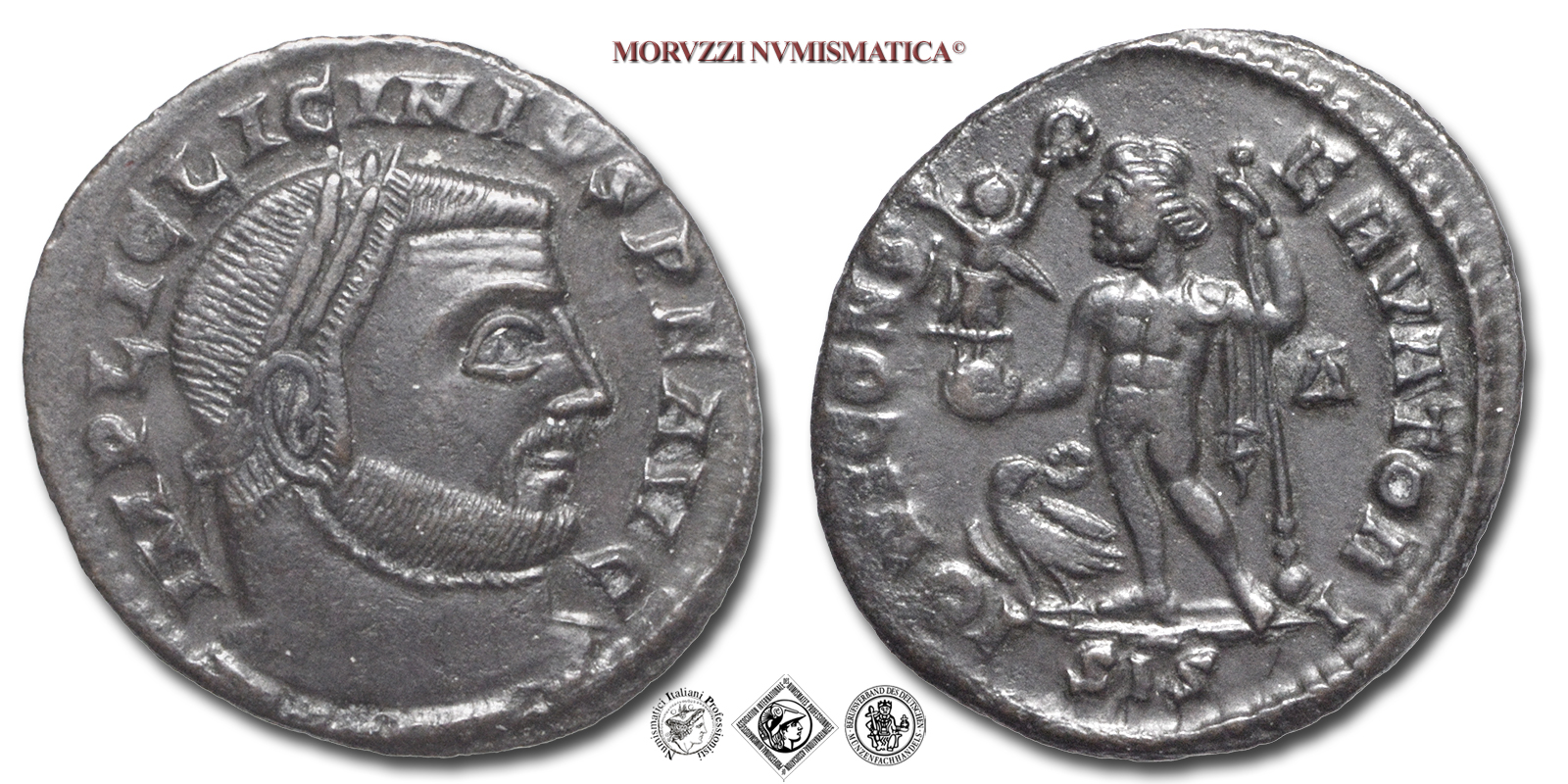 Impero Romano, LICINIO I, 308-324 d.C., FOLLIS RIDOTTO, Emissione: 313 d.C., D/ IMP LIC LICINIVS P F AVG, busto laureato con corazza a destra, R/ IOVI CONSERVATORI, ∆, SIS, Giove stante a sinistra con globo niceforo nella destra tiene lo scettro. AI suoi piedi un'aquila con corona nel becco, Zecca di Siscia, Rif. bibl. R.I.C., 229a; Cohen, 66; Metallo: AE, gr. 3,50, (MR27162), Diam.: mm. 20,94, mBB