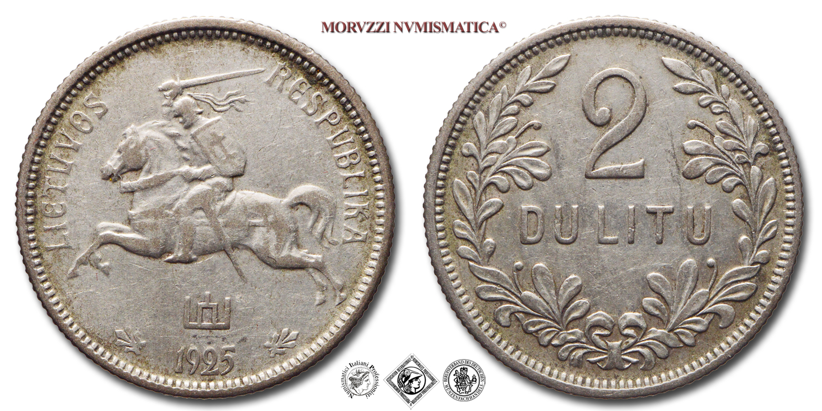 Lituania, REPUBBLICA, DULITU 2, Emissione: 1925, D/ LIETUVOS RESPUBLIKA, stemma nazionale e data (1925), R/ Valore (2 / DU LITU) all'interno di una corona fiorita, Zecca di Vilna, Rif. bibl. KM, 77; Metallo: AR, gr. 5,33, (ME153790), Diam.: mm. 22,96, BB
