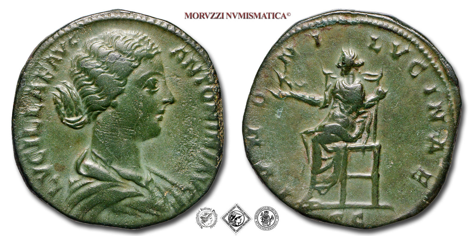 Impero Romano, LUCILLA, Moglie di Lucio Vero, 164-182 d.C., SESTERZIO, Emissione: 164-180 d.C., D/ LVCILLAE AVG ANTONINI AVG F, busto ammantato a d., R/ IVNONI LVCINAE, S C, Giunone seduta in trono a s. tiene un fiore nella d. protesa e con il braccio s. sorregge un neonato avvolto in fasce, Zecca di Roma, Rif. bibl. R.I.C., 1747 var.; Cohen, 37/Fr. 8; Metallo: AE, gr. 25,90, (MR159329), Diam.: mm. 29,84, mBB, (R)