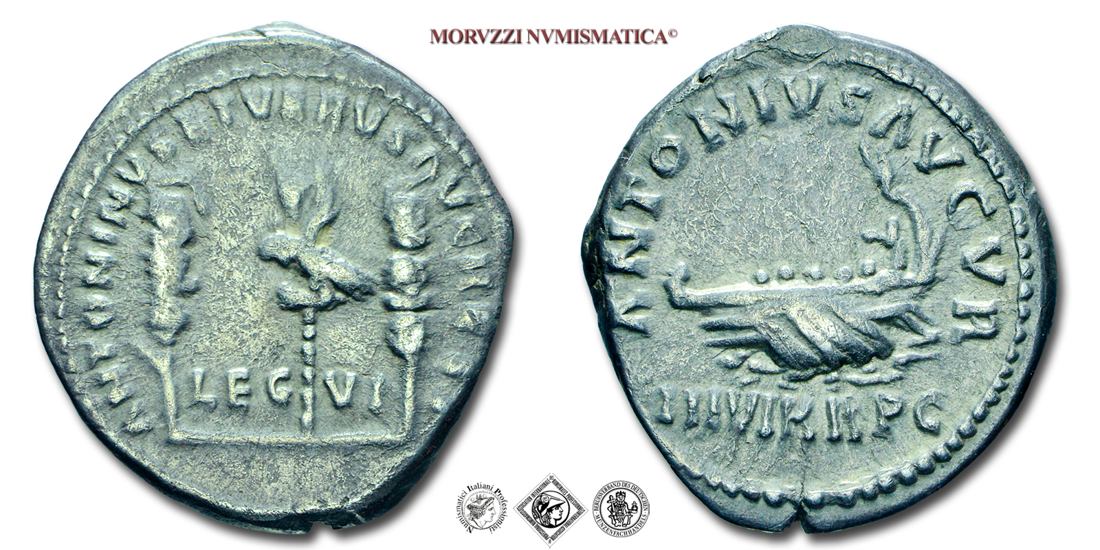 Impero Romano, MARCO ANTONIO, 161-180 d.C., DENARIO LEGIONARIO DI RESTITUZIONE, Emissione: 161-169 d.C., D/ ANTONIVS AVGVR / IIIVIR R P C, galera a destra, R/ ANTONINVS ET VERVS AVG REST / LEG VI, l'aquila legionaria tra due insegne, Zecca Roma, Restituzione di Marco Aurelio, Rif. bibl. R.I.C., 443/S; Cohen, 83; Metallo: AR, gr. 2,99, (MR154189), Diam.: mm. 19,75, BB, (R)