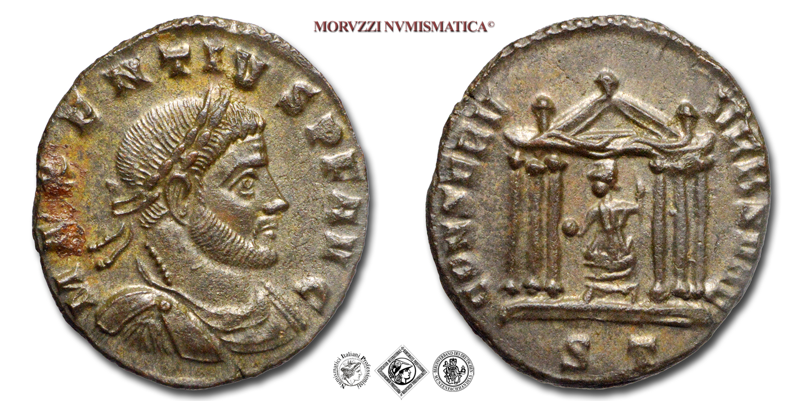 Impero Romano, MASSENZIO, 306-312 d.C., FOLLIS, Emissione: 307-308 d.C., D/ MAXENTIVS P F AVG, busto laureato con paludamento e corazza a destra, R/ CONSERV VRB SVAE, S T, tempio esastilo all'interno del quale vi è la statua di Roma seduta, Zecca di Ticinum, Rif. bibl. R.I.C., 95; Cohen, 28; Metallo: AE, gr. 6,82, (MR160315), Diam.: mm. 22,58, SPL, (NC)