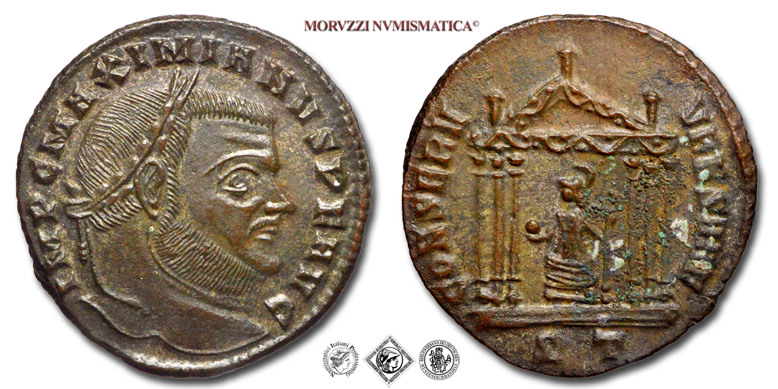 Impero Romano, MASSIMIANO ERCULEO, 286-310 d.C., FOLLIS, Emissione: 307 d.C., D/ IMP C MAXIMIANVS P F AVG, testa laureata a destra, R/ CONSERVATORES VRB SVAE, TT, tempio esastilo con statua di Roma galeata e seduta al centro, Zecca di Ticinum, Rif. bibl. R.I.C., 86/S; Cohen, 75; Metallo: AE, gr. 5,78, (MR160326), Diam.: mm. 21,63, mSPL