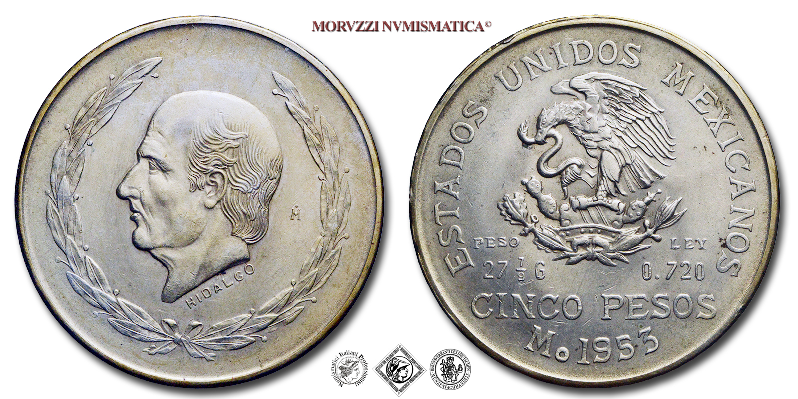 MESSICO, Miguel Hidalgo, PESOS 5, Emissione: 1953, D/ Lo stemma nazionale del Messico al centro con una legenda (ESTADOS UNIDOS MEXICANOS) intorno alla parte superiore della moneta e il contenuto (PESO 27 7/9 G) e la purezza (LEY 0.720) dell'argento divisi dall'emblema su entrambi i lati e il valore in lettere (CINCO PESOS) sotto e il segno di zecca insieme alla data (Mo 1953) in basso, R/ Busto di Hidalgo rivolto a sinistra circondato da una corona d'alloro; sotto il troncamento del collo: HIDALGO, Zecca di Città del Messico, Rif. bibl. KM, 467; Metallo: AR, gr. 27,77, (ME163036), Diam.: mm. 39,91, SPL