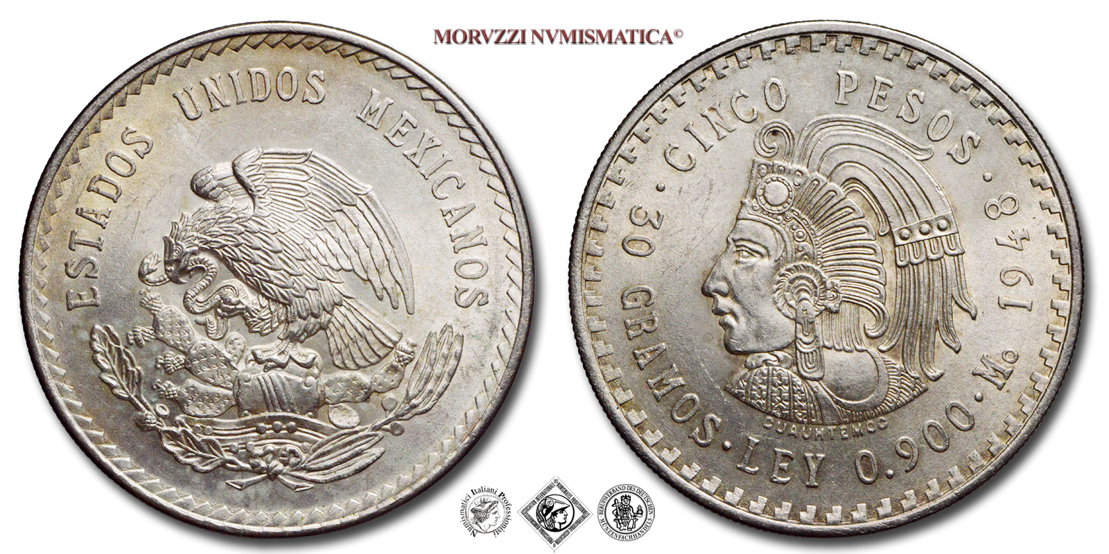 Messico, STATI UNITI, PESOS 5, Emissione: 1948, D/ ESTADOS UNIDOS MEXICANOS, Aquila messicana in rilievo che mangia un serpente a sonagli e si appollaia su un cactus di fico d'India con sotto un gruppo di foglie di quercia e di yupo (?), R/ CINCO PESOS 30 GRAMOS . LEY 0.900 . Mo 1948, Azteco huei tlatoani (il grande oratore, sovrano) Cuauhtémoc al centro e ripetizione della forma a "L" intorno al bordo, Zecca di Città del Messico (Casa de Moneda de México), Rif. bibl. KM, 465; Metallo: AR, gr. 30,08, (ME163038), Diam.: mm. 39,93, FDC