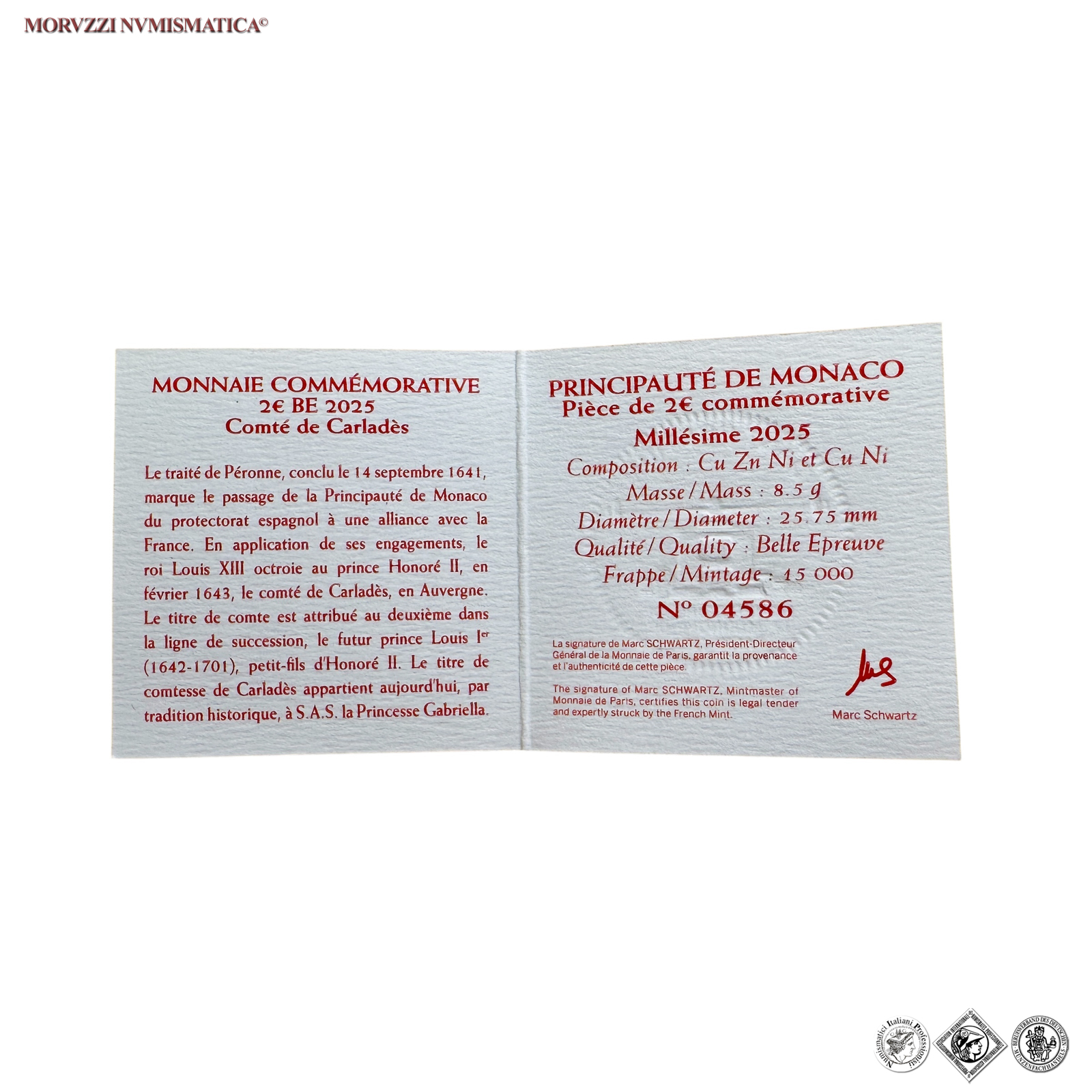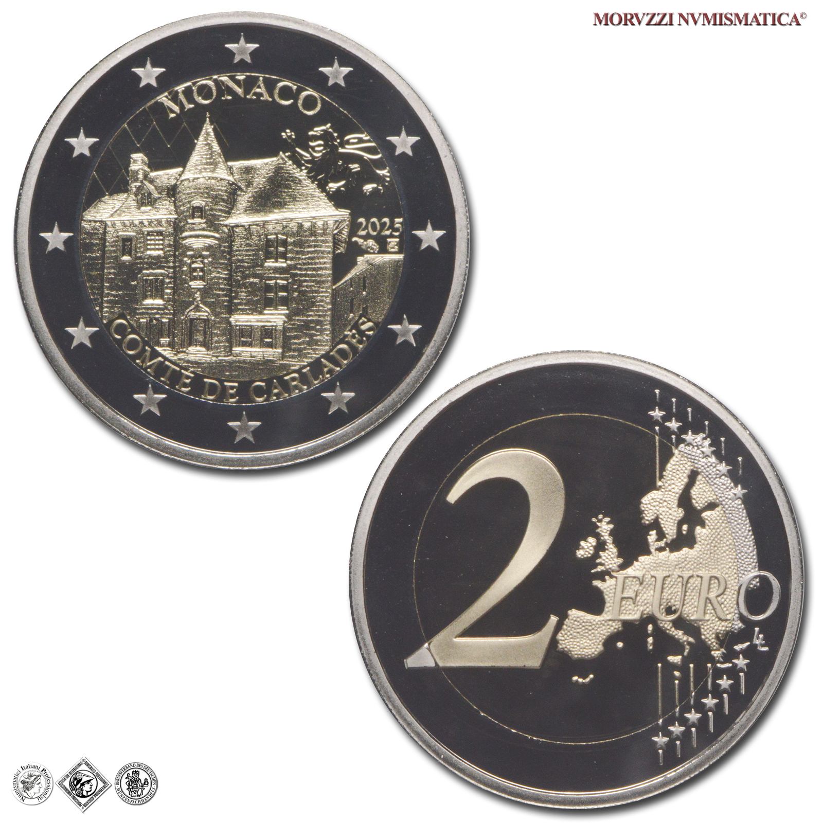 Principato di Monaco, ALBERTO II, Dal 2005, EURO 2, Emissione: 2025, Contea di Carladès, moneta bimetallica da 2 euro, nell'astuccio originale corredato da certificato di garanzia numerato, D/ La parte interna della moneta reca, al centro, l’antica fortezza di Carlat, oggi scomparsa, che si trovava nella Vicecontea di Carladès. In alto, il nome del paese di emissione (MONACO) è preceduto da uno scudo a forma di diamante a sinistra e dal leone, animale araldico di Carlat, collocato a destra. In basso, COMTÉ DE CARLADÈS, e a destra l’anno di emissione (2025) insieme ai simboli di zecca della Monnaie de Paris, che ha realizzato l’emissione, e del suo incisore generale (Joaquin Jiménez). Sul bordo esterno 12 stelle a cinque punte rappresentanti l'Unione Europea, R/ 2 EURO, mappa dell'Unione Europea e le 12 stelle dei paesi fondatori della moneta unica; LL nella parte esterna, Zecca di Parigi; Metallo: CU/NI, gr. 8,50, Diam.: mm. 25,75, FS