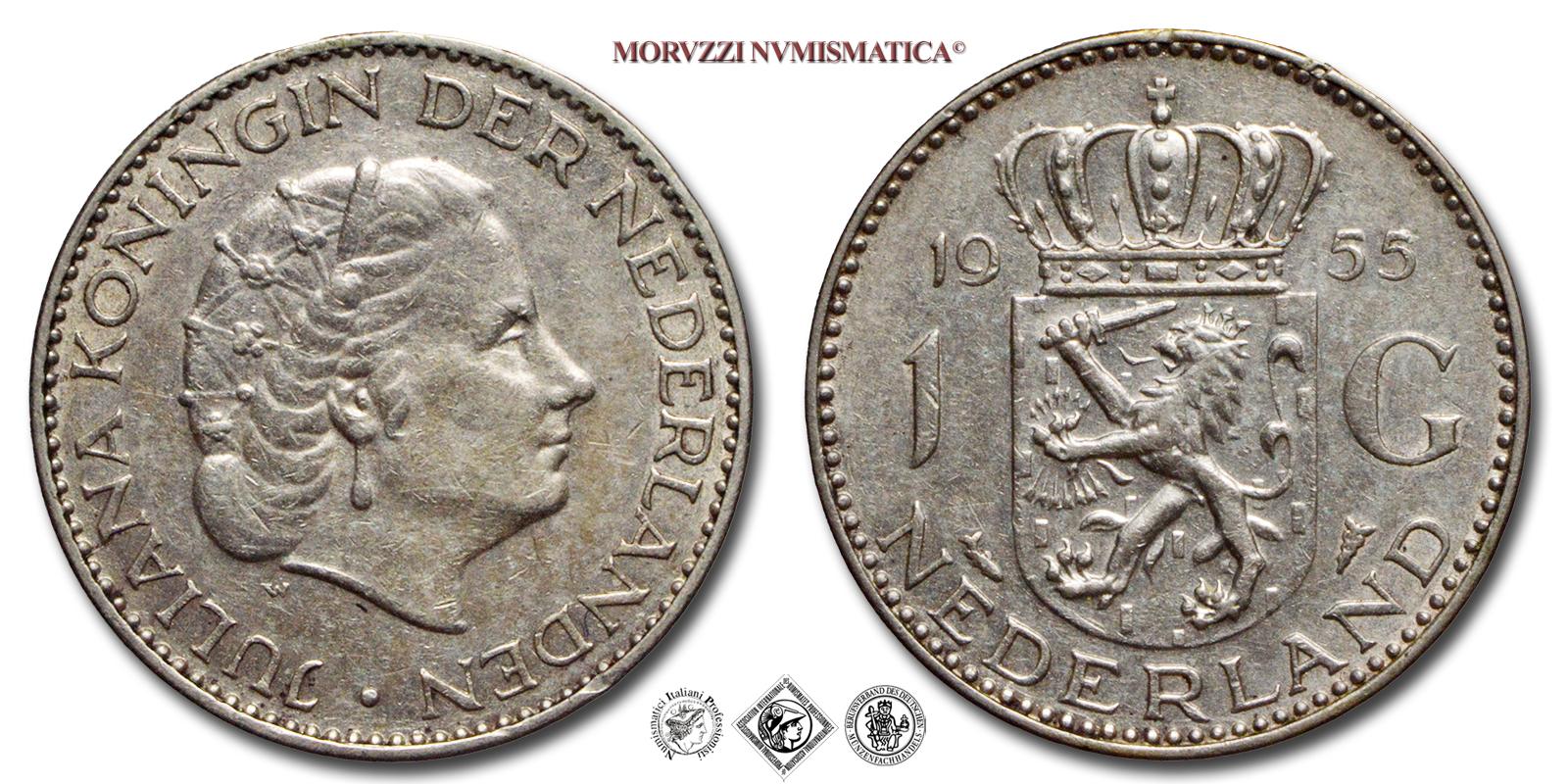Olanda, GIULIANA, GULDEN, Emissione: 1955, D/ JULIANA KONINGIN DER NEDERLANDEN · W, testa di Giuliana rivolta a destra, R/ NEDERLAND 1 G, stemma coronato divide la data (19 55), Zecca di Utrecht, Rif. bibl. KM, 184; Metallo: AR, gr. 6,50, (ME161444), Diam.: mm. 25,00, mSPL
